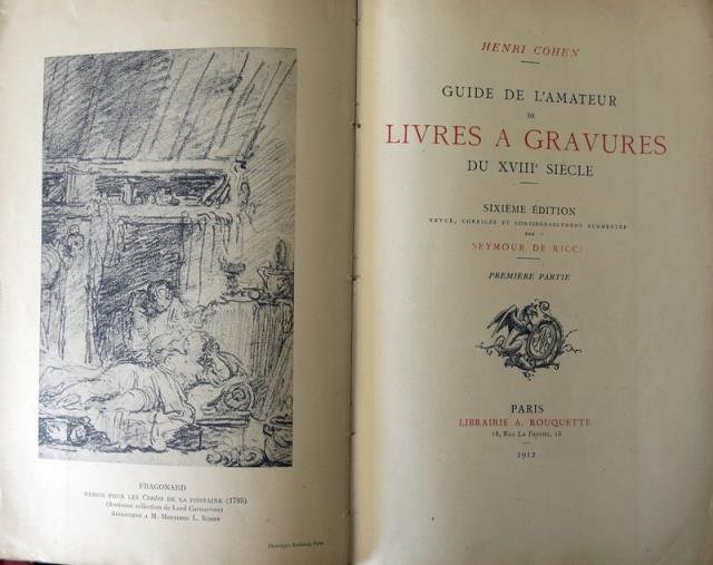 Sixième éditions. Revue, Corrigée et Considérablement augmentée par Seymour De Ricci. Paris, Librairie A. Rouquette, 1912. Tiratura limitata di 1050 esemplari, il ns. è l’esemplare num. 391. In 4to, pp. XXVI, 1247, antip. figurata, frontalini, capilettera e finalini, m. fotoincisioni in b/n n. t., leg. in mz. pelle e punte con titolo in oro al dorso (conservata sotto l'originale brossura in carta), carta marmorizzata ai piatti, ai contropiatti e ai fogli di guardia. Ricco repertorio divenuto il riferimento bibliografico fondamentale per i libri francesi illustrati con incisioni del XVIII. Buone condizioni.