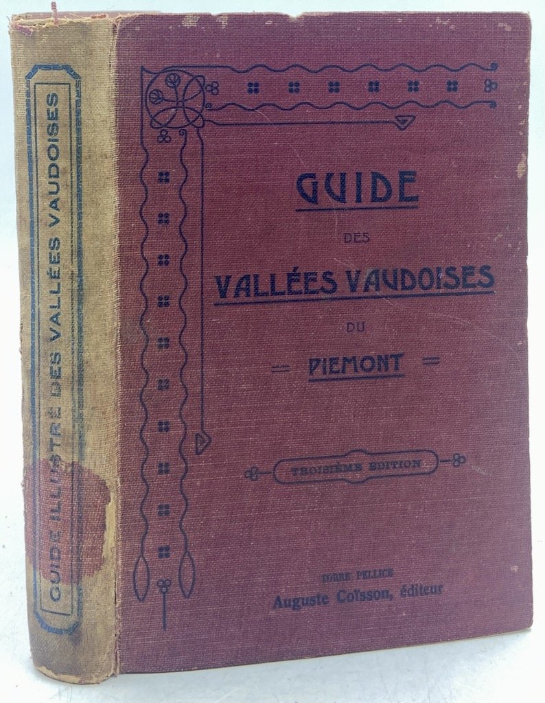 Tela editoriale con titoli a stampa, cm 16 x 11, pp 353 (1) + VI di indice, 70 illustrazioni in nero nel testo, 3 panorami ripiegati, 1 carta topografica in tasca a fine volume; alcune pagine pubblicitarie in carta velina intercalate al testo. Dorso reincollato e scolorito, discreto esemplare da studio. Terza edizione di questa guida delle Valli Valdesi inizialmente apparsa nel 1898 per opera di D. Peyrot, J. Gardiol, J. Rinet, J. Jalla e D. Rivoir, membri della Société Vaudoise d’Utilité Publique che la diede alle stampe. La parte introduttiva si compone di un piccolo vocabolario dei termini topografici, Notice Historique sur les Vaudois, Notice Bibliographique, Notice Géographique (Val Pélis, Val S. Martin, Rive droite du Val Pérouse); seguono le sezioni dedicate a PROMENADES & EXCURSIONS (La Tour, St Jean, Vallon d’Angrogne, Vallon de la Luserne, Villar et Bobi, Prarustin, Rocheplate et Envers-Portes, Vallon de Pramol, le Pomarè, Le Perrier, Vallon de Massel, Vallon de Pral), a COLS & PASSAGES (Du Val Pélis à la Vallée du Po, Du Val Pélis au val Queyras, Du Val Pélis au Val St. Martin, Du Val St. Martin au Val Queyras, Du Val St. Martin à la Vallée de la Doire Ripaire, Du Val St. Martin au Val Cluson) e a 18 ASCENSIONS. Compaiono in questa terza edizione un breve scritto di Henri Pons sulla flora delle valli e un panorama di Torre Pellice (che si aggiunge alle vedute dal Monte Granero e dalla Punta Cournour). BNCAI p. 55; Hugon Gonnet, 3139; non in Perret.