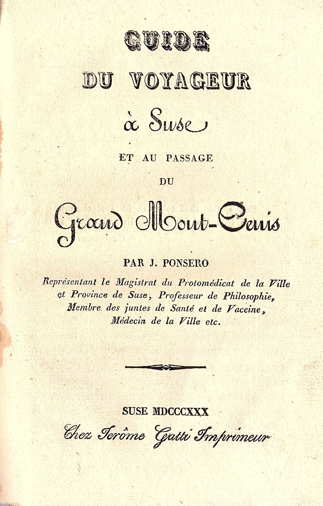 In-8° (215x132mm), pp. 67, (1), mezza pelle coeva con angoli e titolo dorato su tassello applicato al dorso, piatti carta marmorizzata, tagli rossi, sgaurdie carta decorata policroma. Non conservati i piatti della brossura originale. Fresco esemplare. Rara edizione originale di questa ottocentesca guida di Susa e del Moncenisio e di Lans-le-Bourg, uno dei primissimi libri impressi a Susa. Alcune tabelle con dati statistici (ad es. sulla longevità), servizi di posta, tempio di percorrenza a piedi e in vetture, altimetrie comparative dei passi delle Alpi. Il Ponsero era vice-protomedico e professore di filosofia a Susa, nonché membro dell'Académie de Savoie. Manca al Manno e al in Lozzi.