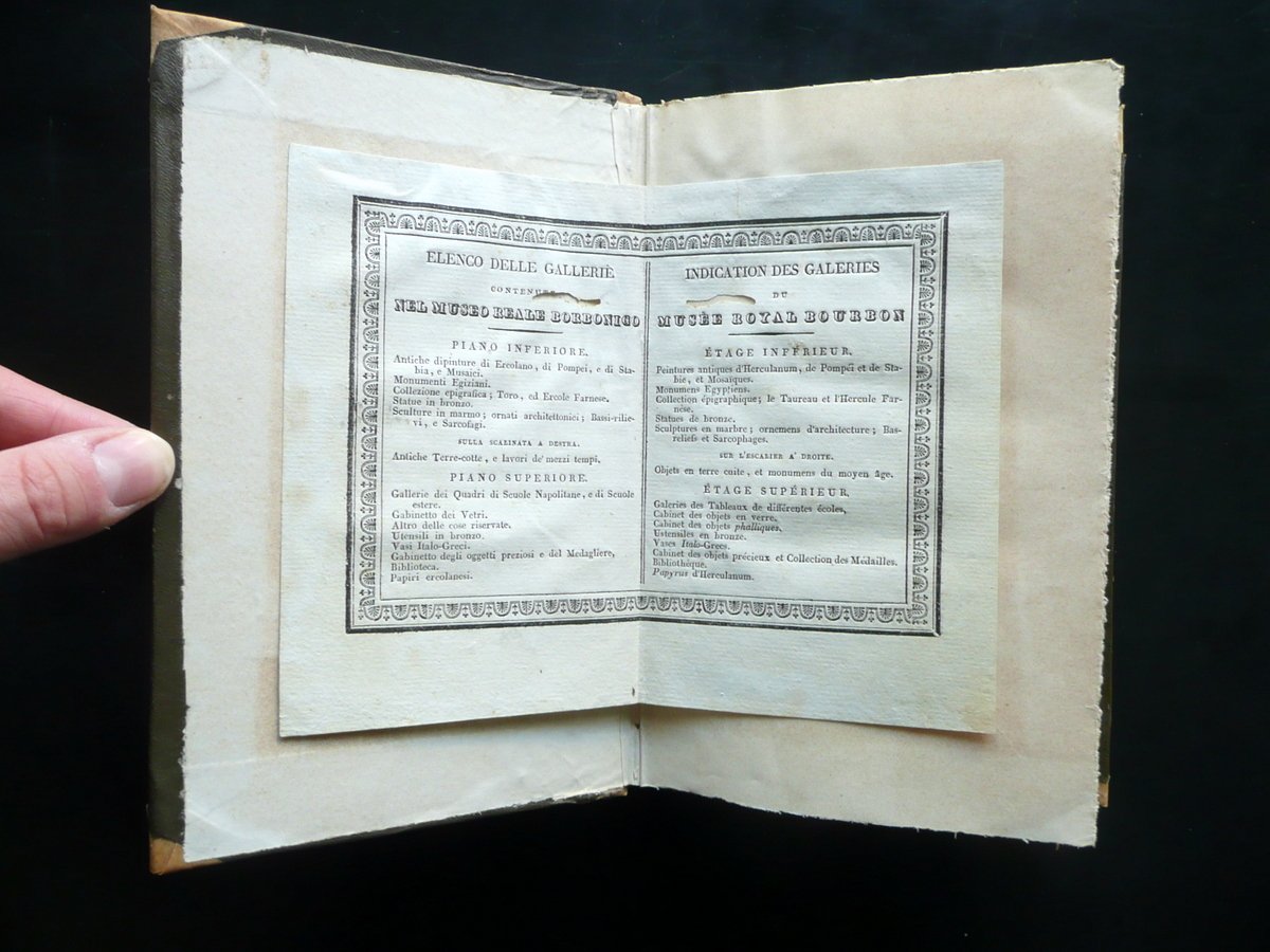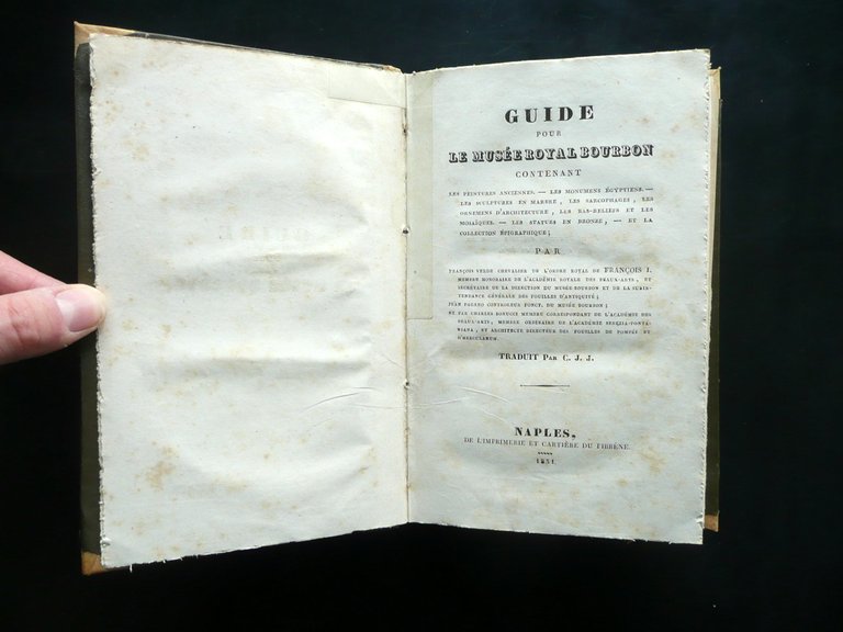 Guide pour le Musee Royal Bourbon contenant les peintures anciennes - les monuments egyptiens - les sculptures en marbre, les sarcophages, les ornemens d'architecture, les bas-reliefs et les mosaiques - les statues en bronze - et la collection epigraphique par François Verde, chevalier de l'Ordre Royal de François I, [.] traduit par C. J. J. De l'Imprimerie et Cartiere du Fibrene, Naples 1831; cm 20,5x13; pp. XVI-240; legatura in mezza pergamena (dorso e angoli) con titolo impresso in oro entro tassello al dorso. Testo in francese. Elenco delle gallerie a stampa, bilingue (francese e italiano), applicato al contropiatto ant. e alla prima bianca (vedi foto). Condizioni di conservazione Esemplare ben conservato con tracce d'uso, coperta con minimi accenni di sporco principalmente al dorso. Interni buoni con alcune piccole leggere bruniture; margini di qualche pagina con piccole mancanze o strappetti, restaurate mediante l'applicazione di strisce di carta; margine esterno delle pp. 53-54 con uno strappetto di alcuni cm che non compromette la lettura del testo. Elenco delle gallerie a stampa con un piccolo camminamento da tarlo alla parte sup. (vedi foto). Testo in francese. SETT153.L14791 N