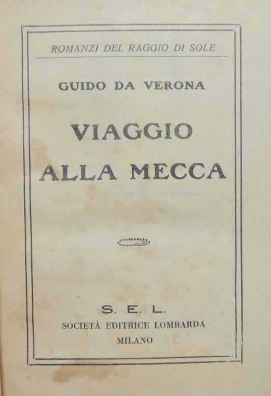 Guido da Verona, Viaggio alla Mecca, S.e.l. Società Editrice Lombarda, Milano 1932, seconda ed., pp. 348, ill. b.n., cm 19, legatura in mezzasimiltela con titoli al dorso. Collana Romanzi del raggio di sole. Tracce d’uso, un’annotazione a lapis all’occhiello. fioriture, leggera brunitura della carta, ma nel complesso copia ancora in condizioni accettabili.