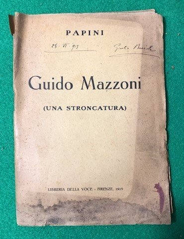 In 4°; 46, (2) pp. Brossura editoriale con traccia di polvere sul margine esterno. Antica nota di possesso privato che identifica l'esemplare come appartenuta ad un noto critico d'arte al margine superiore del piatto anteriore. All'interno in buone condizioni di conservazione. Prima edizione di questo scritto di Giovanni Papini che rappresenta una delle più sarcastiche critiche dell'opera del poeta, italianista e uomo politico fiorentino, Guido Mazzoni (Firenze, 12 giugno 1859 Firenze, 29 maggio 1943).