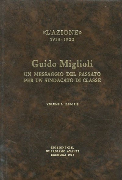 2 v. (XL, 558 p.; XXXII, 558 p.) ; 25 x 17 cm. Raccolta antologica degli scritti del sindacalista cattolico Guido Miglioli (1879-1954) pubblicati dal periodico «L'Azione». Vol. 1: 1918-1919; Vol. 2: 1920-1922. Presentazione di Bruno Storti. Legatura editoriale, coperta in cartone rigido in similpelle di colore marrone scuro con impresso il titolo in oro al piatto e al dorso. Codice libreria 633.