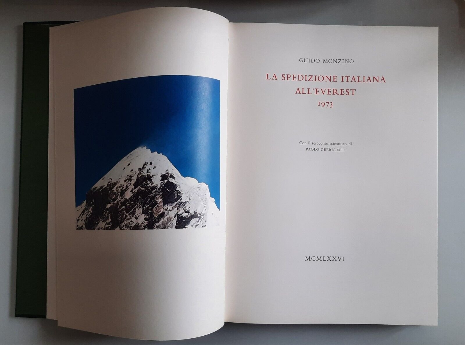 GUIDO MONZINO LA SPEDIZIONE ITALIANA ALL'EVEREST 1973 MONZINO ED. 1976In folio, legatura editoriale, copertina telata con tassello al dorso, ill. a colori, custodia muta.In ottime condizioni, lievissimi segni alla custodia.