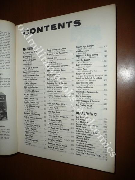 DESCRIZIONE: Follett, Chicago, 1965. In 4°, br. ed. ill. a col., pp. 384 con centinaia di ill. b/n n.t., 1^ ediz. Volume in lingua inglese che raccoglie una sessantina di articoli a diversa firma, in gran parte sulle armi da fuoco di produzione americana di ogni epoca. Indice completo in foto. CONDIZIONI: Discrete. Dorso con molte pieghe, uno strappetto fra copertina e dorso all'angolo superiore, varie pieghe in prima e quarta di copertina. Carta con qualche fioritura. PESO / WEIGHT: 800 gr. without package