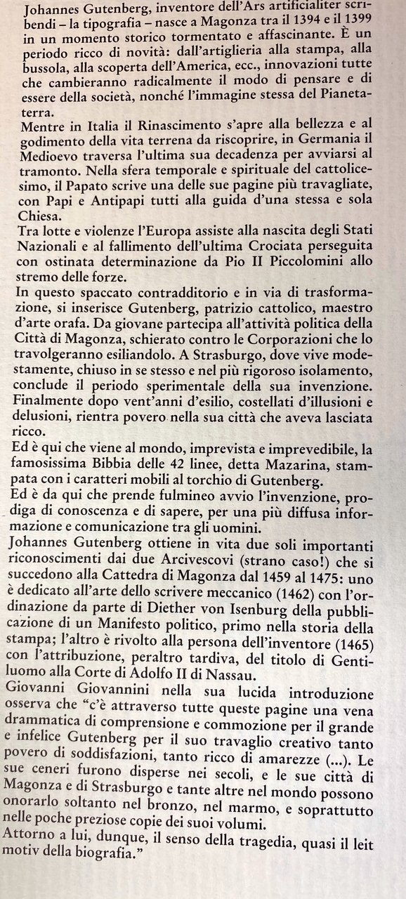 Johannes Gutenberg, inventore dell'Ars artificialiter scribendi, la tipografia, nasce a Magonza tra il 1394 e il 1399 in un momento storico tormentato e affascinante. È un periodo ricco di novità: dall'artiglieria alla stampa, alla bussola, alla scoperta dell'America, innovazioni tutte che cambieranno radicalmente il modo di pensare e di essere della società, nonché l'immagine stessa del Pianeta terra. Mentre in Italia il Rinascimento s'apre alla bellezza e al godimento della vita terrena da riscoprire, in Germania il Medioevo traversa l'ultima sua decadenza per avviarsi al tramonto. Nella sfera temporale e spirituale del cattolicesimo, il Papato scrive una delle sue pagine più travagliate, con Papi e Antipapi tutti alla guida d'una stessa e sola Chiesa. Tra lotte e violenze l'Europa assiste alla nascita degli Stati Nazionali e al fallimento dell'ultima Crociata perseguita con ostinata determinazione da Pio II Piccolomini allo stremo delle forze. In questo spaccato contradditorio e in via di trasformazione, si inserisce Gutenberg, patrizio cattolico, maestro d'arte orafa. Da giovane partecipa all'attività politica della Città di Magonza, schierato contro le Corporazioni che lo travolgeranno esiliandolo. A Strasburgo, dove vive modestamente, chiuso in se stesso e nel più rigoroso isolamento, conclude il periodo sperimentale della sua invenzione. Finalmente dopo vent'anni d'esilio, costellati d'illusioni e delusioni, rientra povero nella sua città che aveva lasciata ricco. Ed è qui che viene al mondo, imprevista e imprevedibile, la famosissima Bibbia delle 42 linee, detta Mazarina, stampata con i caratteri mobili al torchio di Gutenberg. Ed è da qui che prende fulmineo avvio l'invenzione, prodiga di conoscenza e di sapere, per una più diffusa informazione e comunicazione tra gli uomini. Johannes Gutenberg ottiene in vita due soli importanti riconoscimenti dai due Arcivescovi che si succedono alla Cattedra di Magonza dal 1459 al 1475: uno è dedicato all'arte dello scrivere meccanico (1462) con l'ordinazione da parte di Diether von Isenburg della pubblicazione di un Manifesto politico, primo nella storia della stampa; l'altro è rivolto alla persona dell'inventore (1465) con l'attribuzione, peraltro tardiva, del titolo di Gentiluomo alla Corte di Adolfo II di Nassau. Giovanni Giovannini nella sua lucida introduzione osserva che c'è attraverso tutte queste pagine una vena drammatica di comprensione e commozione per il grande e infelice Gutenberg per il suo travaglio creativo tanto povero di soddisfazioni, tanto ricco di amarezze (...). Le sue ceneri furono disperse nei secoli, e le sue città di Magonza e di Strasburgo e tante altre nel mondo possono onorarlo soltanto nel bronzo, nel marmo, e soprattutto nelle poche preziose copie dei suoi volumi. Attorno a lui, dunque, il senso della tragedia, quasi il leit motiv della biografia.