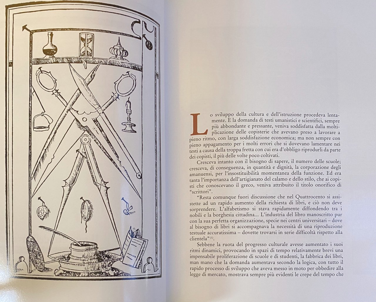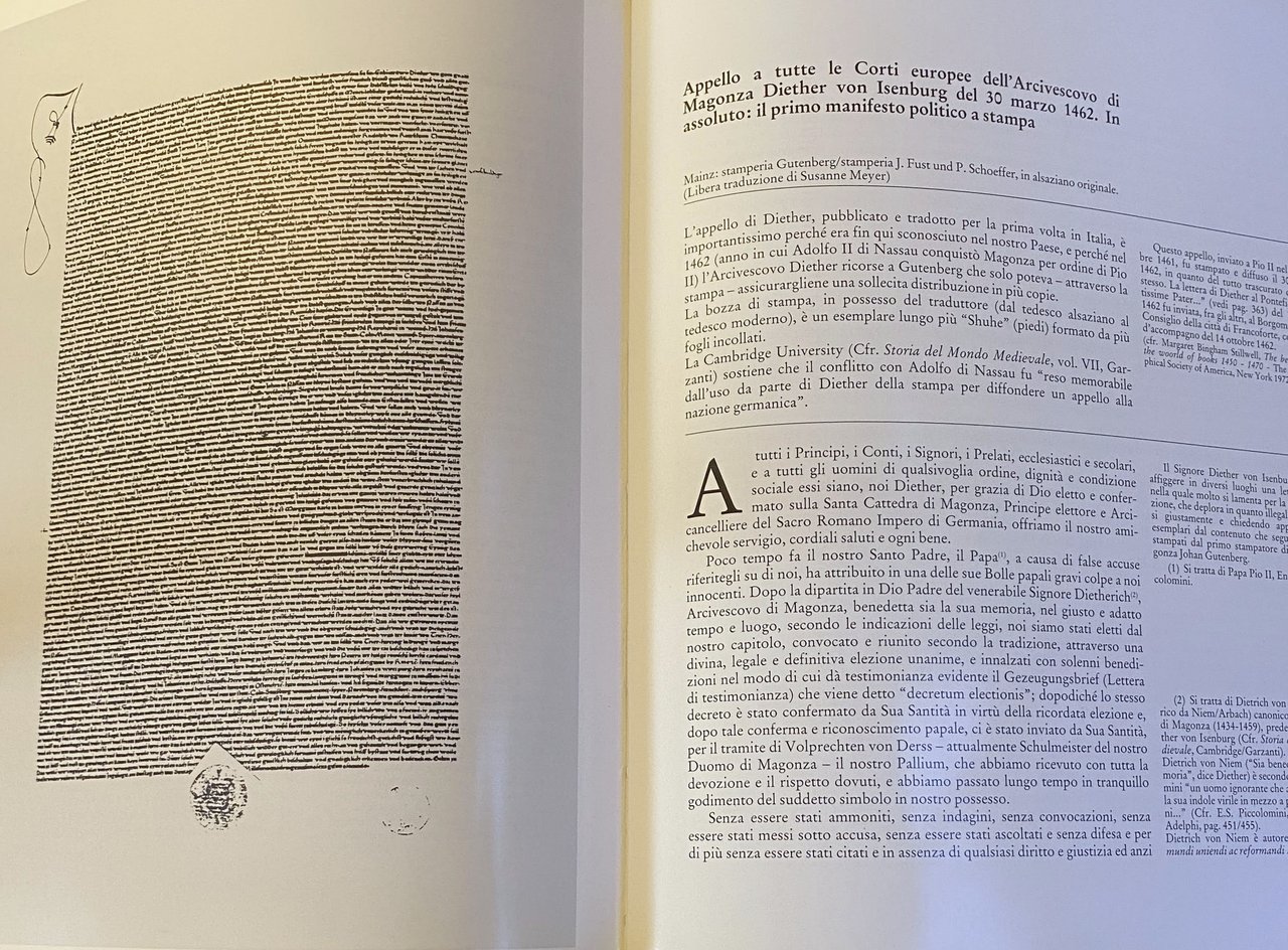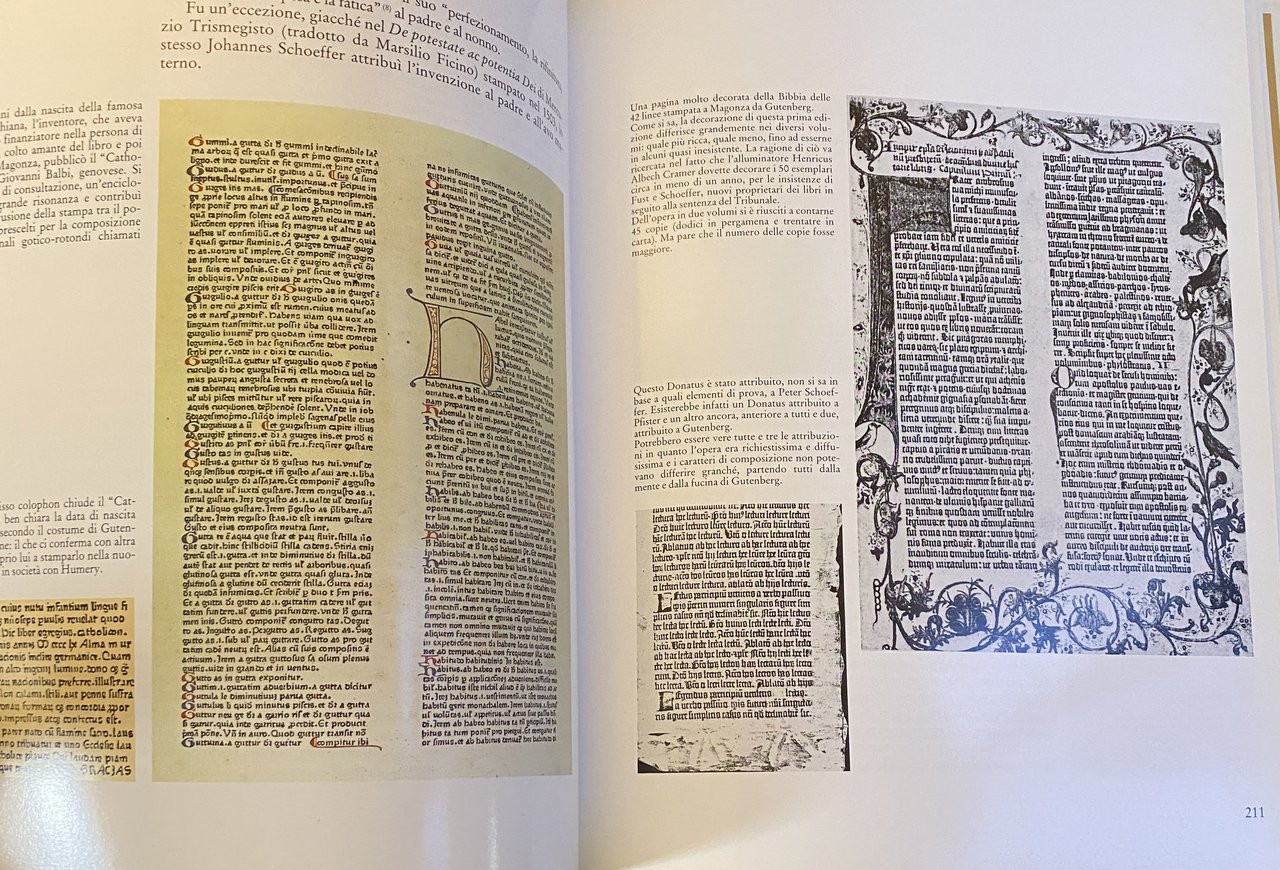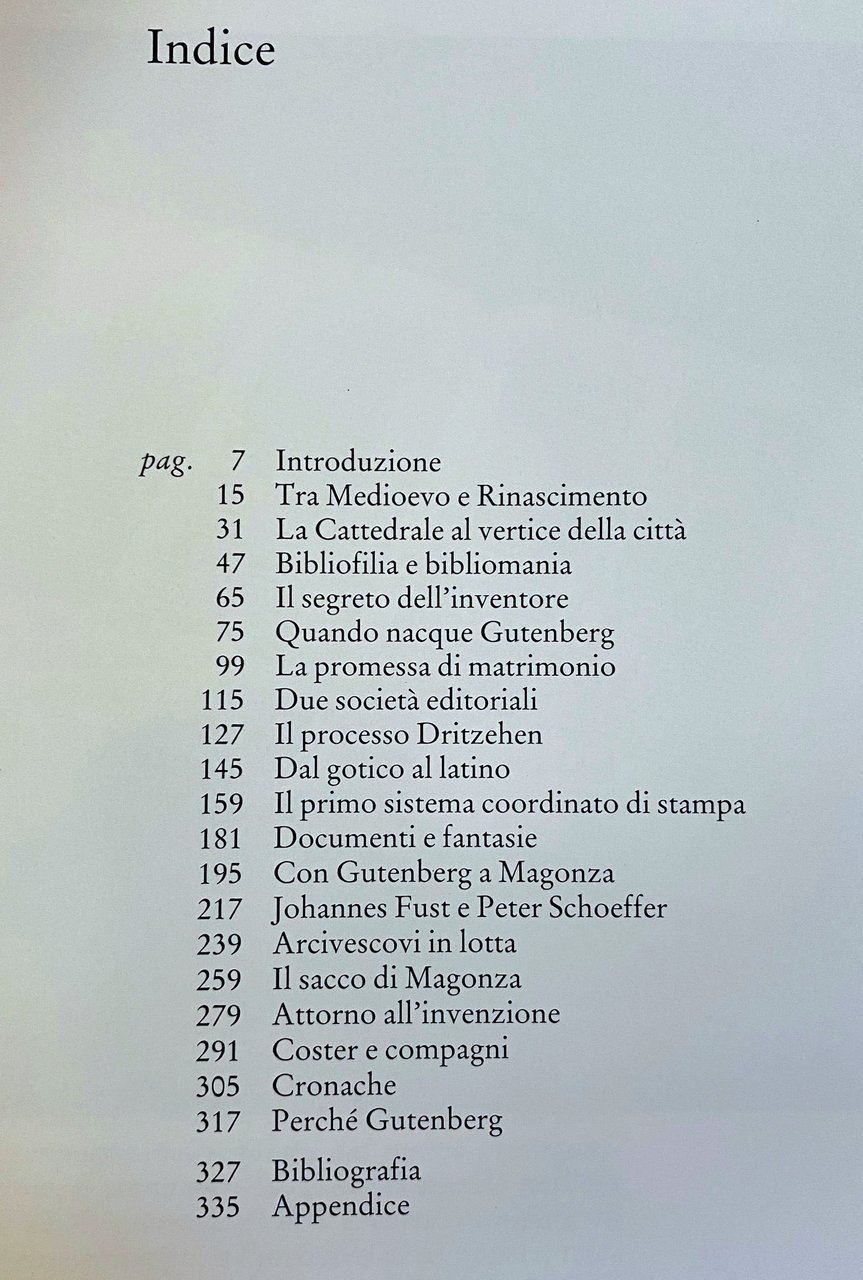Soggetti: Storia medievale Stampa Editoria Scrittura Medioevo Rinascimento Cattedrale Città Bibliofilia Bibliomania Inventore Johannes Gutenberg Società editoriali Processo Dritzehen Gotico Latino Sistema coordinato Documenti Fantasie grafiche Caratteri mobili Germania Johannes Fust Peter Schoeffer Arcivescovi Sacco Invenzioni Coster Cronache Bibliografia Appendice Libri illustrati rari Edizioni pregiate Collezionismo Fuori catalogo Innovazioni Galassia McLuhan Invenzione Comunicazione Bibbia Papi Antonio Campano Apostolica Apuleio Bartolo Sassoferrato Bessarione Biblioteca Apostolica Vaticana Carta Città Vaticano Classici Codici Colofone Commento Cosmographia Decorazioni Incunabolo Epistolae Esemplari Farenga Fascicoli Fogli Formato Giuridici Gotici Hain Historia Iniziali Incunabolo Lattanzio Lauer Libro Lignamine Manoscritti Mercato Miglio Modigliani Niccolò Officina Opere Pelle allumata Perotti Pomponio Leto Produzione Prototipografi Puecher Regiomontano Restauro Rubricatore Girolamo sant'Agostino Scrittura Stampate Subiaco Sublacense Sweynheym Tecnica Tedeschi Testi Tolomeo Torchi Umanistico Tipografia Xilografia Aldo Manuzio Pauperum Bruno Fabbiani Calibro Carattere Colophon Composizione Copie Dritzehen Europa Fabri Francesco Griffo Frontespizio Fust Gilberto Barbero Giovanni Paoli Grafia In-folio Inchiostro Jacopino Suigo Arte tipografica Lastre Rame Legno Lettere Libreria Antiquaria Gilibert Matrice Madre Metallografica Paoli Pergamena Punzonatura Punzoni Riga Salterio Tabellare Stampatori Stamperia Strasburgo Tecnigrafo Venezia Adolfo Nassau Armagnacchi Arnesi Bernardo Cennini Carlo VII Castaldi Catholicon Corporazioni Coster d'Armagnac Diether Dritzehen Elio Donato Eltville Ferrigni GENSFLEISCH LADEN Germania Gian Galeazzo Visconti Giudizio universale Haarlem Humery Jenson Inventore Mainz Nobili Notizie Orafi Panfilo Castaldi Parigi Patriziato Subiaco Biografie Memorie Aneddotica Curiosità Medievistica Carlo Argan Arés Georges Duby Vittorino da Feltre Braudel Chabod Alfabeto Febvre Eugenio Garin Guignard Umanesimo Kuhn Le Goff Leclerq Lehmann Mumford Lutero Riforma protestante Chiesa Cristianesimo Teologia Albrecht Durer Neret Panofsky Henri Pirenne Rivoluzione scientifica Ritter Otto Fuhrmann Processo Strasburgo Documenti Dritzehen Eckhart Metallo Piombo Pressa 42 linee Vulgata Flusser Testi antichi Diritto Medicina Messali Liturgici Letteratura latina Universitari Opuscoli Latino Volgare Arnold Pannartz De Civitate Dei Parsons-Scheide Gesuiti Cina Matteo Ricci Pfister Sensenschmid Anton Koberger Colonia Basilea Norimberga Napoli Colonia Roma Ulrich Han Giovanni da Spira Sixtus Riessinger Bernardo Cennini Foligno Johannes Numeister Mantova Paolo Butzbach Jesi Federico de' Conti Parigi Michael Friburger Ulrich Gering Martin Crantz Johannes Heynlin Sorbona Budapest Andrea Hess Bruges Colard Mansion Lovanio Thierry Martens Vestfalia Valencia Lambert Palmart Siviglia Barcellona Lione Barthélemy Bouver Londra William Caxton Oxford Theodoric Rood Ginevra Adam Steinschaber Faro Samuel Gacon Ottaviano Petrucci Albert Kapr Angelo Poliziano Marsilio Ficino Ermete Trismegisto Famiglia de Medici Este Cortigiani Intellettuali Bibliofili Collezionisti Biblioteche private Montefeltro Studiolo bibliografico Vespasiano da Bisticci Librai editori Pubblicazioni Medievistica Medieval History Printing Publishing Writing Middle Ages Renaissance Cathedral City Bibliophilia Inventor Publishing Companies Gothic Latin Coordinated System Documents Graphic Fantasies Movable Types Germany Mainz Archbishops Inventions Coster Chronicles Bibliography Appendix Rare Illustrated Books Valuable Editions Collecting Out of Print Innovations Galaxy Invention Communication Bible Popes Apostolic Apuleius Library Paper Vatican City Classics Codices Colophon Commentary Cosmographia Decorations Incunabulum Epistolae Specimens Fascicles Sheets Format Legal Gothic Historia Initials Incunabulum Lactantius Lignamine Manuscripts Market Millet Workshop Works Alumed Leather Perotti Production Prototypographers Regiomontanus Restoration Rubricator St. Augustine Writing Printed Technique Germans Texts Ptolemy Presses Humanistic Typography Xylography Caliber Character Colophon Composition Copies Europe Title Page Handwriting Ink Typographic art Plates Copper Wood Letters Antique bookshop Matrix Mother Metallographic Parchment Punching Punches Rule Psalter Table Printers Printing house Strasbourg Drawing board Venice Tools Corporations Germany Last Judgement Inventor Nobles News Goldsmiths Paris Patrician Biographies Memoirs Anecdotes Curiosities Medieval studies Alphabet Humanism Luther Protestant Reformation Church Christianity Theology Scientific revolution Trial Strasbourg Documents Metal Lead Press 42 lines Vulgate Ancient texts Law Medicine Missals Liturgical Latin literature University books Pamphlets Vernacular Jesuits China Cologne Basel Nuremberg Naples Cologne Rome Sorbonne Louvain Thierry Seville Barcelona Lyon London Geneva Courtiers Intellectuals Bibliophiles Collectors Private libraries Bibliographic study Booksellers publishers Publications Medieval studies