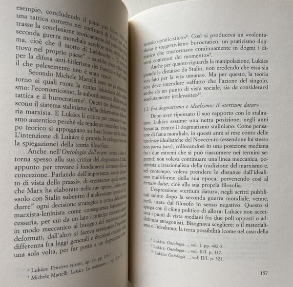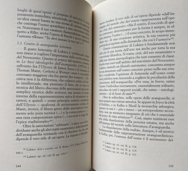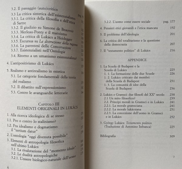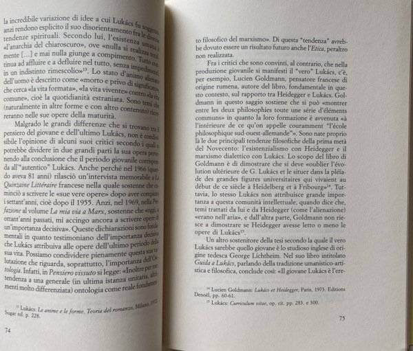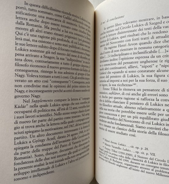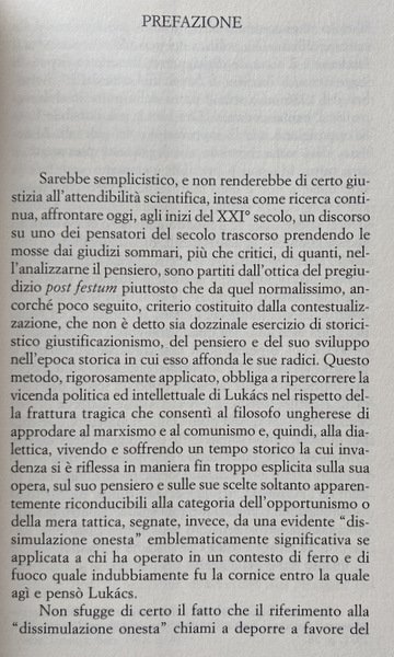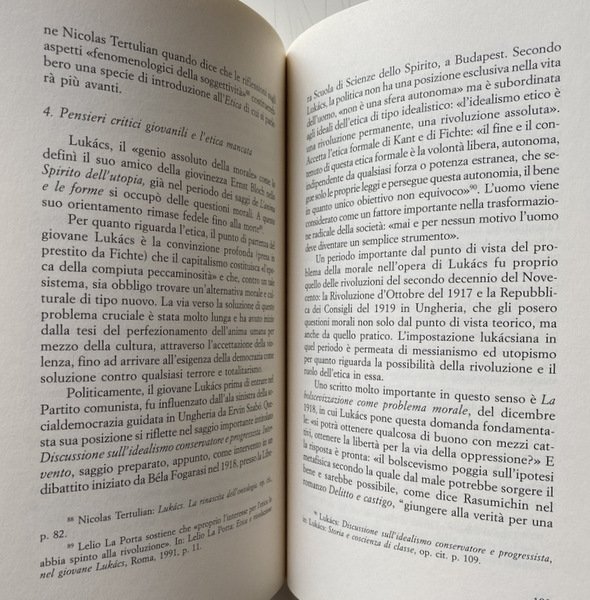 Senza indulgenza verso gli spettri più inquietanti della personalità e della prassi di pensiero lukácciana, misurando inoltre l'immagine ufficiale e stereotipata del filosofo con i tentativi altrettanto strumentali di depoliticizzarne gli intenti, l'autore non rinuncia a verificare di volta in volta l'irriducibilità del contributo lukácciano a un primo o a un secondo momento della sua speculazione. Né il «mito ideologico del giovane Lukács», né una sopravvalutazione della riflessione matura del filosofo sono atti a rendere la complessità del profilo dottrinale dell'opera lukácciana la quale, benché non si presti neppure ad un'operazione di riduzione sintetica unitaria, registra al suo interno una peculiare costante. Peculiare, in quanto costante e peculiare costante in quanto in sé ambivalente: è in simile orizzonte che il saggio di Szabó rintraccia la componente originale delle considerazioni e della personalità di Lukács.