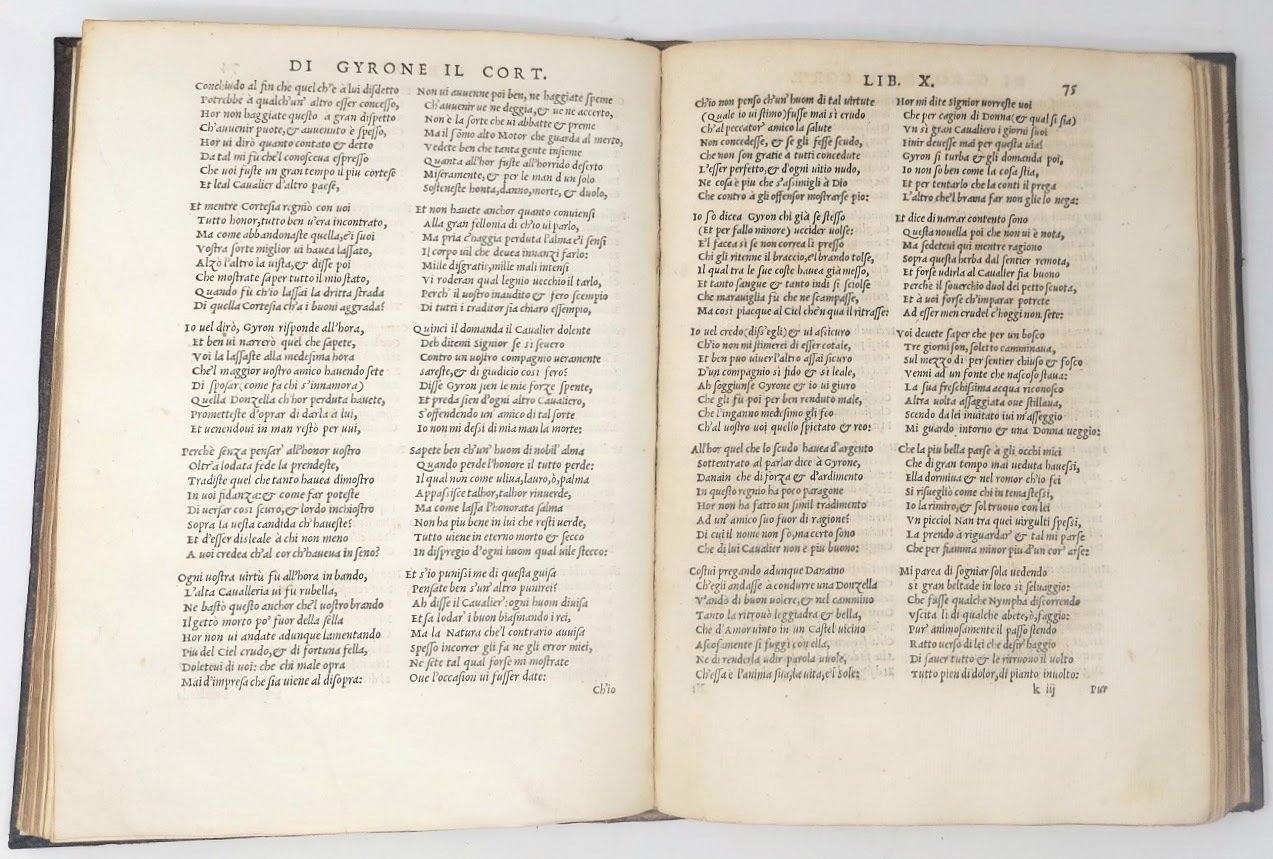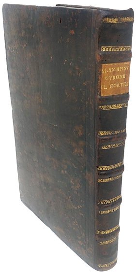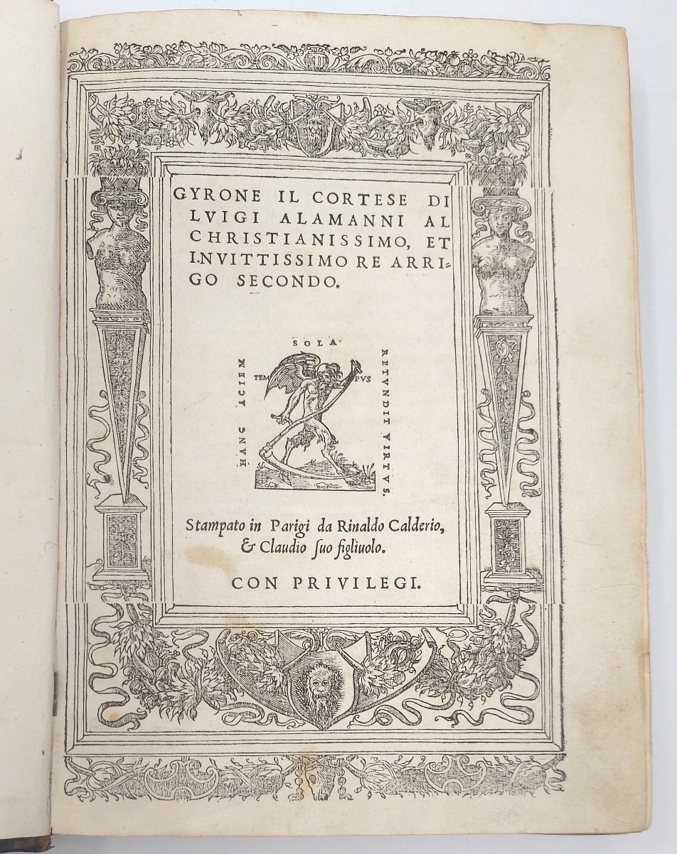 >in-4 (225x160 mm), pp. ff. (8), 180, testo su due colonne in nitidissimo car. corsivo; elegante legatura in piena pelle settecentesca, titolo in oro su tassello, dorso a nervi, tagli dorati (quale piccolo lavoro di tarlo al dorso). Titolo racchiuso in elegante bordura xilogr. con piccola marca tip. al centro, una bella iniz. ornata. Lunga dedica dell'autore al Re di Francia Enrico II nella quale traccia la storia dell'origine e dell'istituzione dei Cavalieri Erranti, detti della Tavola Rotonda. Prima edizione di questo celebre e fortunato poema cavalleresco di 24 libri in ottave, rifacimento abbastanza fedele del romanzo francese in prosa ''Gyron le Courtois''. Ottimo esemplare, lievi e sporadiche macchiette qua e là. Gamba n. 21. Razzolini p. 9-10. Melzi n. 746. Ferrario IV, pp. 230-1. Olschki, Choix XII, 18283.