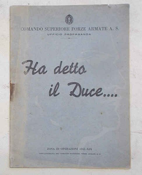 In 8° (cm. 21,5 x 15,5); pagg. 15; leggera cartonatura origin. Qualche traccia d'umido e di ruggine alla graffa che ferma le pagine, ma più che buono. VG- ** Da notare il luogo di pubblicazione "Zona di Operazioni", anche se non è precisato quale.