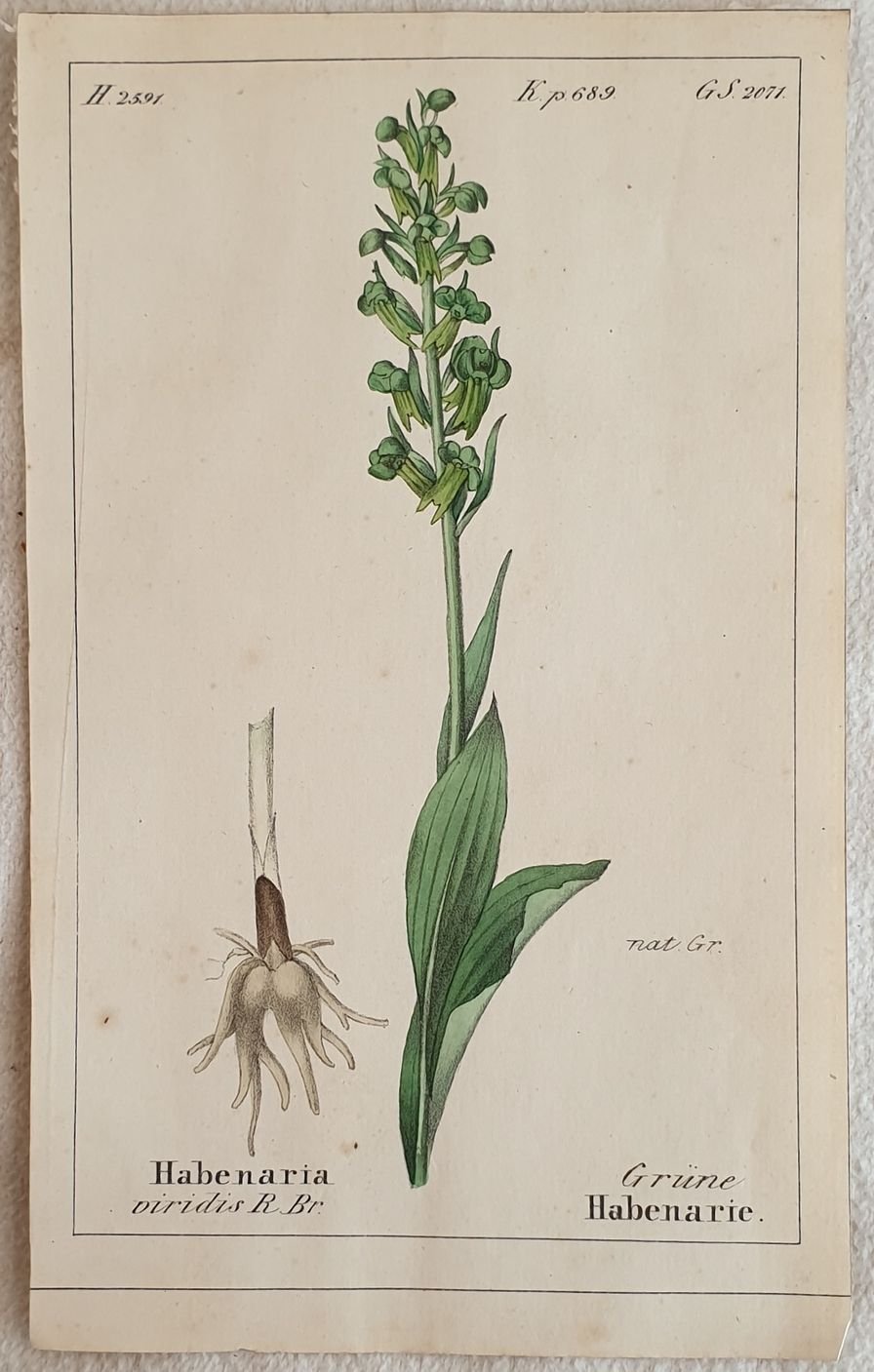 Bella cromolitografia del 1843 tratta dalla celebre opera di botanica "Flora der Schweiz" di Heinrich Romer sulla flora della Svizzera che rappresenta il Habenaria viridis. In buone condizioni, qualche fioritura. Segni di colla al verso. Habenaria viridis TECNICA: Cromolitografia DIMENSIONI FOGLIO: cm 17,5x11 DIMENSIONI INCISIONE: cm 16x9,5 EPOCA: 1843 CONDIZIONI: Buone condizioni, qualche fioritura. Resto di colla al verso. Beautiful chromolythography of 1843 taken form the famous work of botany "Flora der Schweiz" by Heinrich Romer about flowers of Switzerland representing the Habenaria viridis. In good conditions, some foxings. Glue signs in the verso of page Habenaria viridis TECHNIQUE: Lytography PAGE SIZE: cm 17,5x11 PRINT'S SIZE: cm 16x9,5 PERIOD: 1843 CONDITION: good conditions with some foxings. Glue signs in the verso of page.
