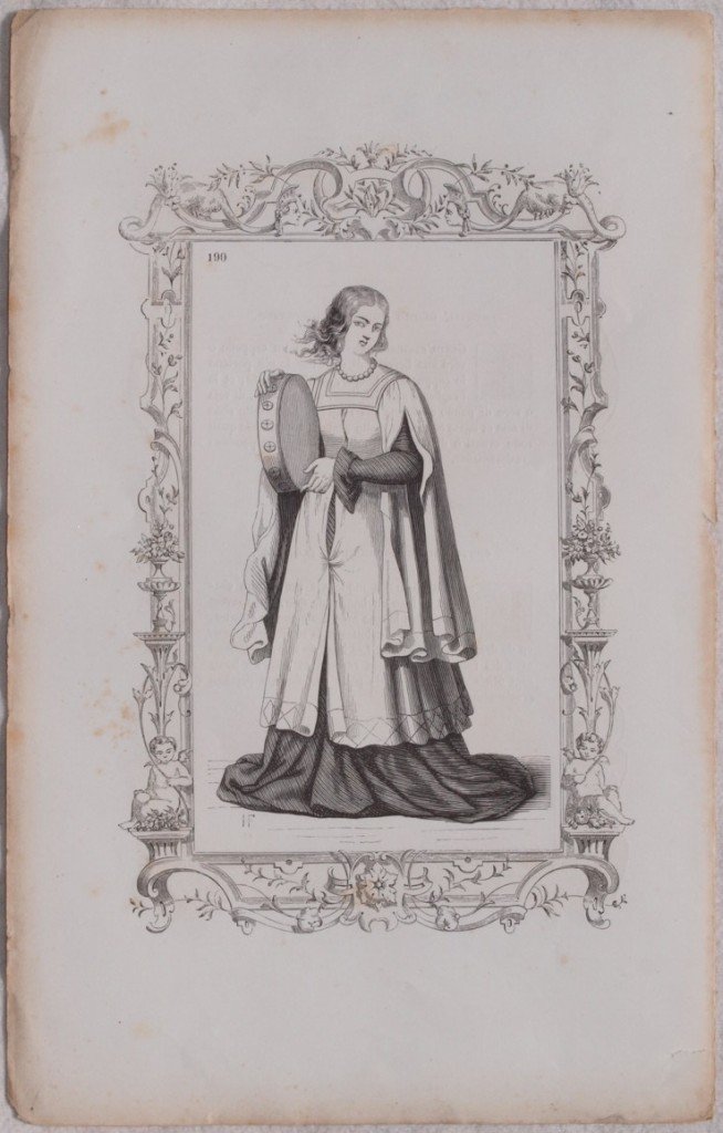 Deliziosa tavola xilografica proveniente dall'edizione ottocentesca della nota opera del 1590 "Habiti antichi et moderni di tutto il mondo di Cesare Vecellio". Le tavole, disegnate dal Vecellio sono riproduzioni dell'edizione cinquecentesca dell'opera Lo scritto, fondamentale per lo studio sul costume ed abbigliamento di ogni genere e luogo, è universalmente celebrato come la più antica enciclopedia sui costumi. La tavola è impreziosita da testo esplicativo contenente notizie e curiosità. INCISIONE: xilografia AUTORE: Cesare Vecellio DIMENSIONI PASSEPARTOUT: cm 23x14,50 DIMENSIONI INCISIONE: cm 16x10,5 EPOCA: 1859 CONDIZIONI: buone condizioni, usure al margine destro, rare fioriture Al verso della tavola presente testo esplicativo che non corrisponde alla planche in questione. Viene fornita copia anastatica della corretta spiegazione della tavola (la foto sottostante del testo è esemplificativa). Nome della tavola a matita. Testo italiano e francese. Nice woodcut coming from the edition of the XIX century of the famous work of 1590 "Habiti antichi et moderni di tutto il mondo di Cesare Vecellio". The planches, drawn by Vecellio are reproduction of the XVI century edition of the work The writing, important work about the costume and appearel of each kind and place, is universally celebrated as the most ancient aencyclopedia about costumes. The planche is enriched by explicative text containing curiosities and information. ENGRAVING: xilography AUTHOR: Cesare Vecellio PASSE-PARTOUT DIMENSION: cm 23x14,50 ENGRAVING DIMENSION: cm 16x10,50 DATE: 1859 CONDITIONS: good; wearings in the right edge and occasional foxings In the verso of the planche there is the explicative text not corresponding to this planche. We provide anastatic copy of the correct explanation (the photo below of the text is just an example) Name of the planche written with pencil Italian and french text.
