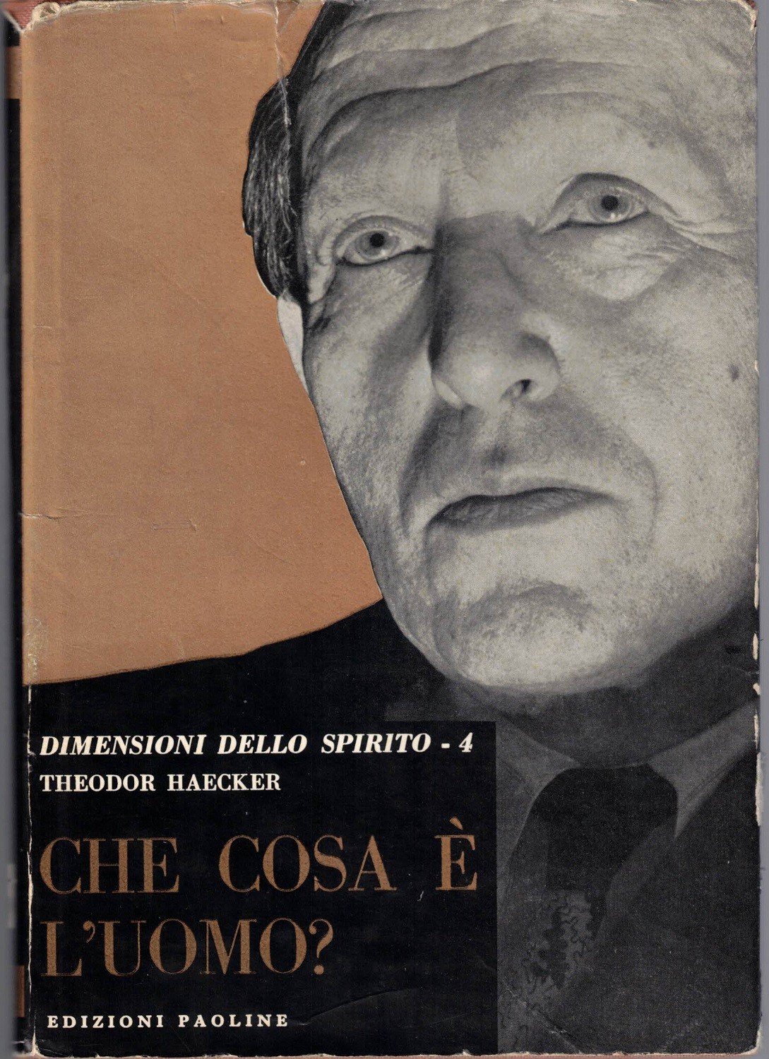 Theodor Haecker, Che cosa è l’uomo, Edizioni Paoline, Alba 1959, pp. 145, cm 19, tela ed. con titoli al dorso e sovraccoperta. Collana Dimensioni dello spirito, 2. Titolo originale: Was ist der mensch? Traduzione di A. Marranzini. Firma d’appartenenza alla carta di guardia anteriore. Marcate tracce d’uso alla sovraccoperta, con strappetti e piccole mancanze ai margini, per il resto leggera brunitura della carta, ma nel complesso buon esemplare.