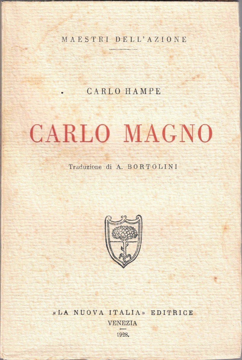 Carlo Hampe (Karl Hampe), Carlo Magno, traduzione di A. Bortolini, La Nuova Italia Editrice, Venezia 1928, pp. 116, cm 20, br. ed. Collana Maestri dell’azione. In calce alla quarta di copertina, vecchia etichetta ed. in carta con prezzo. Leggere tracce d’uso alla brossura con e lievi fioriture e minime ombre di gore ai margini non estese all’interno del volume, lieve brunitura della carta, per il resto molto ben conservato, con brossura solida e interno ottimo. Intonso.
