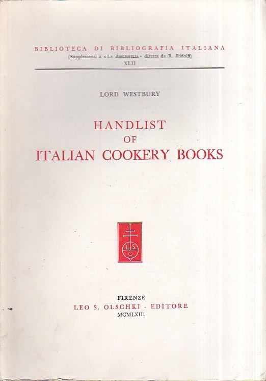 In-8°, pp. XXIII, (1), 227, (3), Illustrazioni in b.n. n.t. e f.t. (una ripiegata). Legatura in m. pelle rossa e angoli con titolo in oro su tassello al dorso. Brossure originali conservate. Perfetto stato. Prima edizione di questa bibliografia referenziale per quanto attiene ai libri culinari italiani. Biblioteca di bibliografia italiana (Supplementi a 'La Bibliofilia' diretta da R. Ridolfi), XLII.