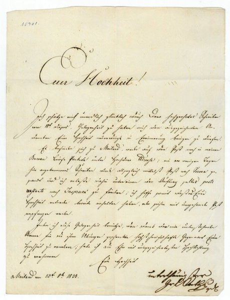 1 S. 4to. An eine namentlich nicht genannte "Hochheit": "Ich schätze mich unendlich glücklich durch Dero hochgeehrtes Schreiben vom 18t. dieses, Gelegenheit zu haben mich dem ausgezeichneten Andenken Euer Hochheit neuerdings in Errinnerung [!] bringen zu dürfen. Es befinden sich zu Mailand, weder auf der Post noch in meinem Bureau Brief-Packete unter hochdero Adresse; ein vor wenigen Tagen hier angekommenes Schreiben wurde allsogleich mittelst Post nach Verona gesandt […]".