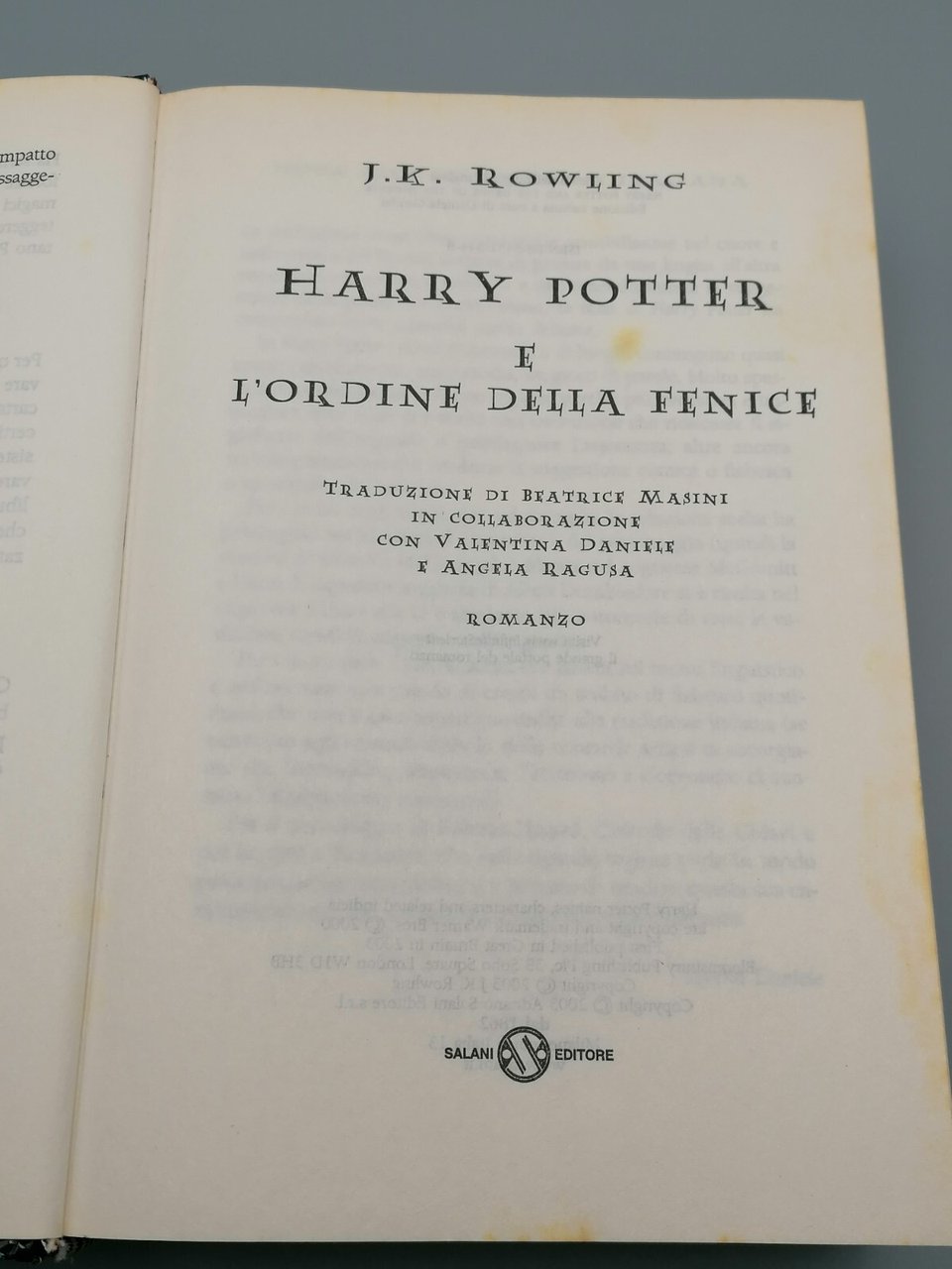 Harry Potter e l'ordine della fenicedi J.K. RowlingEditore: SalaniData di Pubblicazione: 2003, prima edizione assoluta ISBN: 8884513448 Pagine: 808 Formato: rilegato Condizioni del libro Manca la sovraccoperta e vi sono segni di ingiallimento. Nel complesso discreto.