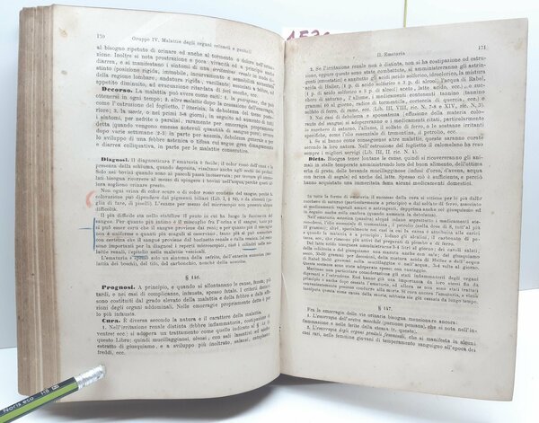 legatura rigida in mezza tela con piatti marmorizzati in condizioni accettabili con alcune abrasioni e segni del tempo, dorso in tela marrone con rotture alle cuffie, segni del tempo, titoli in oro al dorso ed etichetta di catalogazione, tagli bruniti impolverati quelli superiori, alla seconda di copertina ex-libris, legatura a vista ai fogli di guardia, firma di possesso, antiporta con una mancanza di cm. 8 per tutta la lunghezza, frontespizio con fioriture e aloni diffusi e firma di possesso, vedere immagini, interno in condizioni accettabili, fioriture diffuse alle pagine interne e alcune macchie che non disturbano la lettura, sottolineature e appunti a matita rossa matita blu e penna, vedere immagini, all'interno altri due libri, numero pagine 430 + 276 + 83 dimensioni cm 22,5 x 16 x 4,8
