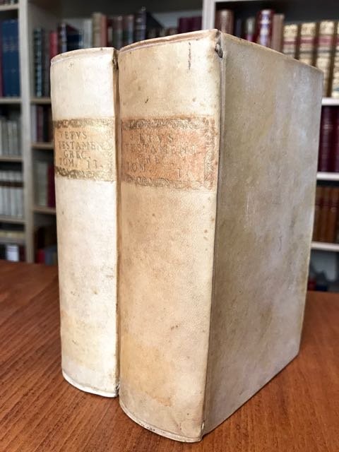 <span style="font-style: normal;">2 volumi in-8° (cm. 16), solide legature coeve in p. pergamena rigida, titolo in oro ai dorsi, tagli rossi; pp. [138] [24] 903 [1b], [2] 928 in buono stato, con lievissime fioriture sparse e una leggera brunitura uniforme. Bibbia in greco, edizione unica con le note di David Mill della </span><i>vulgata</i> dei Settanta. Esemplare molto buono. (NH9)