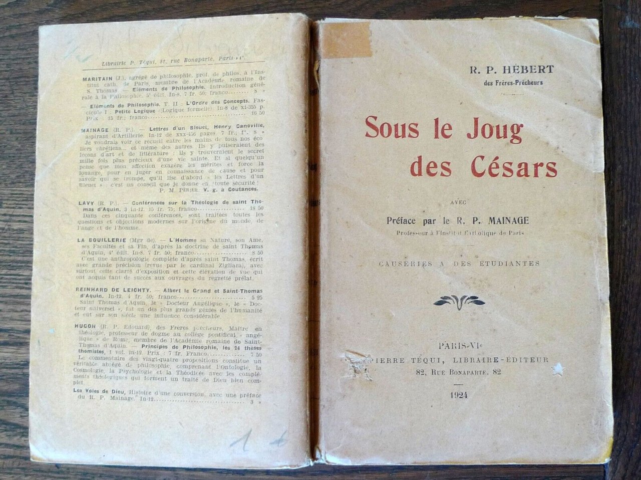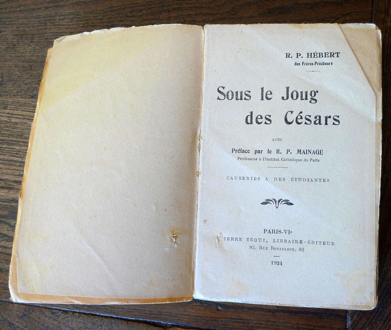 R. P. Hébert,SOUS LE JOUG DES CÉSARS.Avec Préface par le R.P. Mainage,Paris, Pierre Téqui Libraire-Éditeur, 1924,brossura, 19x12 cm., p.XVI-289,testo in francese,peso: g.300