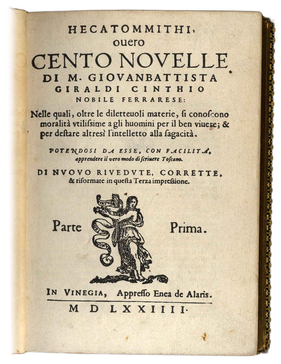 >2 volumi in-4 (202x140 mm), ff. (8), 251, (1 bianco, mancante); 232, (8); stupenda legatura d'amatore del XIX sec. in p. marocchino verde con larga elegante bordura oro ai piccoli ferri sui piatti, dorsi a nervi con tit. e fregi oro, dentelle int., tagli dor. Impresa tipogr. sui frontesp., iniz. silogr., testo in car. corsivo, note a stampa nel margine in car. rom. Dedica dello stampatore a Giovanni Finetti. Terza edizione (dopo la prima del Torrentino, impressa a Mondovì nel 1565, e la seconda dello Scoto, apparsa a Venezia l'anno successivo), postuma (il Giraldi, nato a Ferrara nel 1504, era morto il 30 dic. 1573), contenente in più, in fine al secondo vol., il ''Capitolo dell'Autore intorno agli uomini e donne illustri del tempo suo'' (Gamba). L'edizione è tanto più rara in quanto una delle pochissime opere impresse da Enea de Alaris da solo nel triennio 1573-5, prima di unirsi agli eredi Sessa. Celeberrima raccolta di novelle, che ricalca vagamente la struttura del Decamerone. Le novelle sono distribuite in dieci "deche", ciascuna preceduta da una dedica a vari personaggi, molti dei quali piemontesi. Una brigata di novellatori e novellatrici, che fuggono per mezzo di una nave da Roma a Marsiglia, a causa del sacco delle soldatesche di Carlo V, per distrarsi passono il tempo narrando vari racconti. Com'è noto, si tratta di un'importantissima fonte per il teatro di Shakespeare: due di queste novelle ispirarono le trame di "Otello", di "Misura per Misura", e della "Notte dell'Epifania". Benché considerata per lungo tempo un esempio di letteratura controriformista, l'opera fu messa all'Indice nel 1580; ed è recente la sua rivalutazione critica per l'originalità nell'ambito dei canoni novellistici cinquecenteschi. Esemplare magnifico, impeccabile. Manca a Papanti. Gamba, Novelle ital., p. 120-1: ''E' eseguita con qualche diligenza ed eleganza, ed è certamente migliore di tutte le susseguenti''. Passano p. 354-5. Borromeo p. 29. BMC 305. Adams G-706.