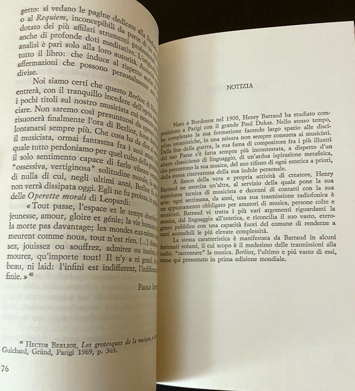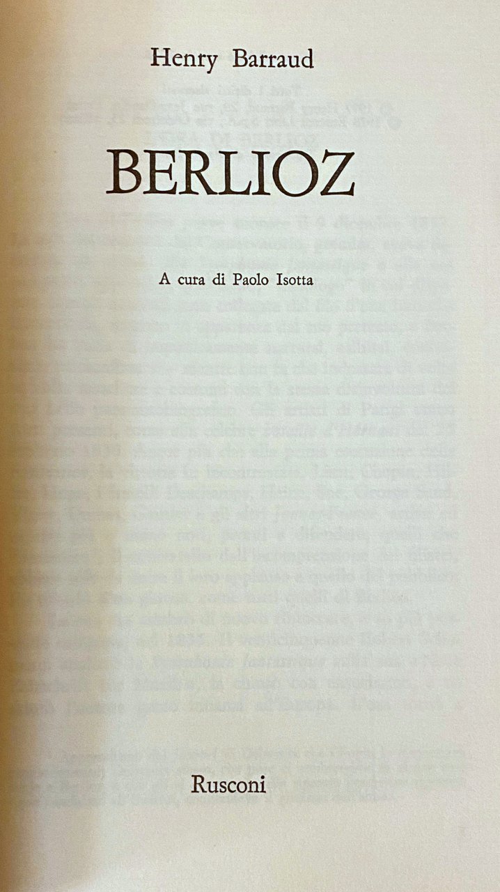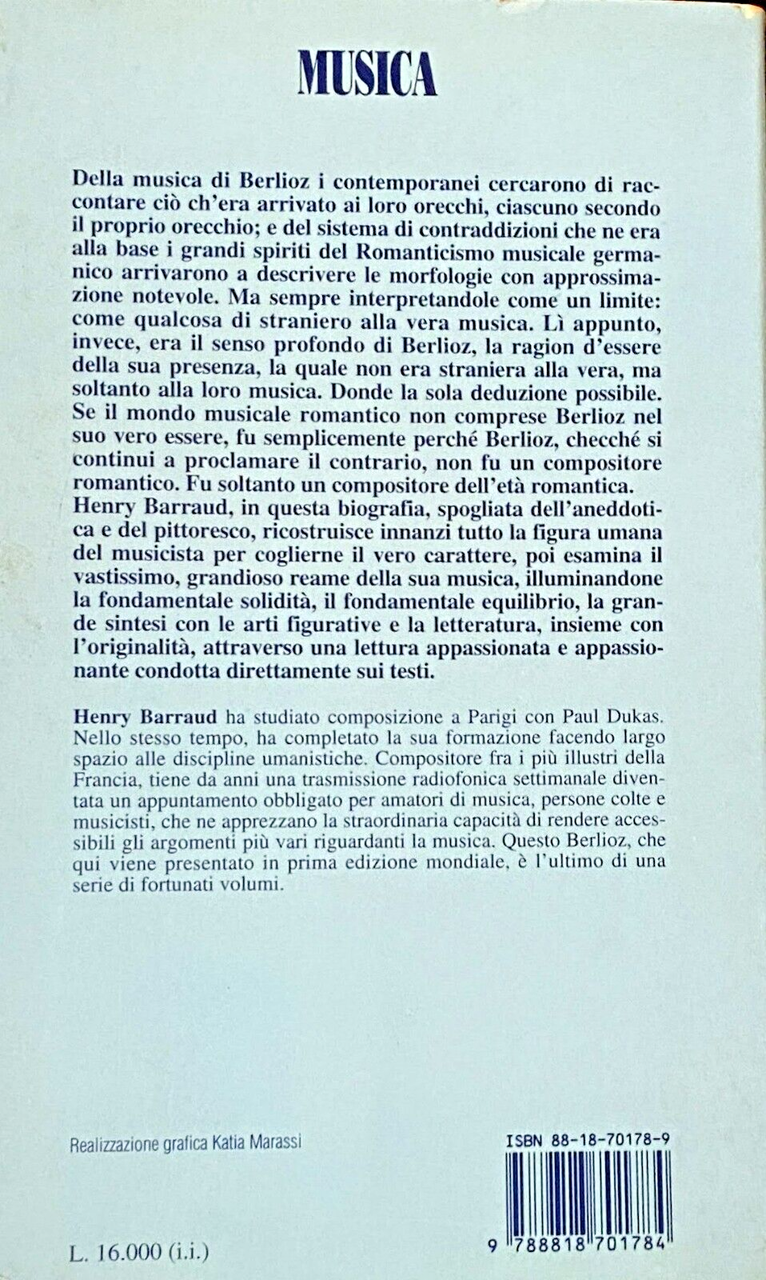 Della musica di Berlioz i contemporanei cercarono di raccontare ciò ch'era arrivato ai loro orecchi, ciascuno secondo il proprio orecchio; e del sistema di contraddizioni che ne era alla base i grandi spiriti del Romanticismo musicale germanico arrivarono a descrivere le morfologie con approssimazione notevole. Ma sempre interpretandole come un limite: come qualcosa di straniero alla vera musica. Lì appunto, invece, era il senso profondo di Berlioz, la ragion d'essere della sua presenza, la quale non era straniera alla vera, ma soltanto alla loro musica. Donde la sola deduzione possibile. Se il mondo musicale romantico non comprese Berlioz nel suo vero essere, fu semplicemente perché Berlioz, checché si continui a proclamare il contrario, non fu un compositore romantico. Fu soltanto un compositore dell'età romantica. Henry Barraud, in questa biografia, spogliata dell'aneddotica e del pittoresco, ricostruisce innanzi tutto la figura umana del musicista per coglierne il vero carattere, poi esamina il vastissimo, grandioso reame della sua musica, illuminandone la fondamentale solidità, il fondamentale equilibrio, la grande sintesi con le arti figurative e la letteratura, insieme con l'originalità, attraverso una lettura appassionata e appassionante condotta direttamente sui testi.