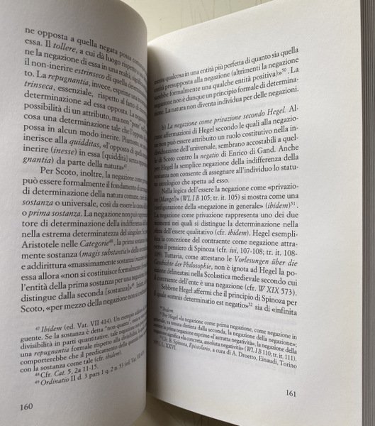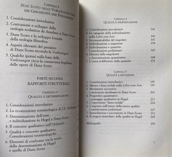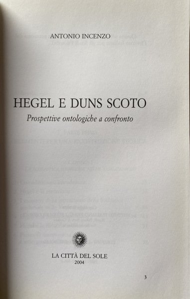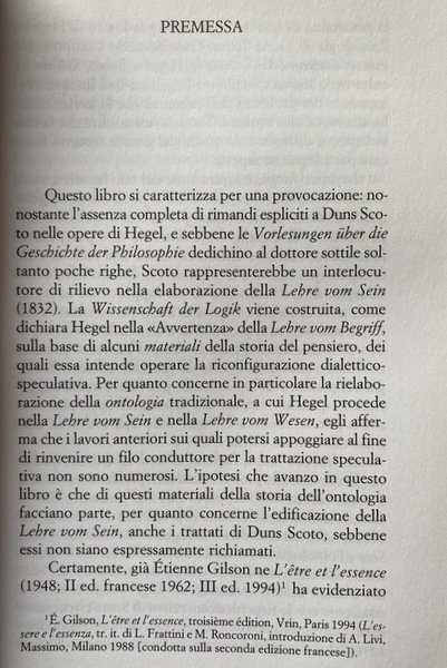 PREMESSA: Questo libro si caratterizza per una provocazione: nonostante l'assenza completa di rimandi espliciti a Duns Scoto nelle opere di Hegel, e sebbene le Vorlesungen über die Geschichte der Philosophie dedichino al dottore sottile soltanto poche righe, Scoto rappresenterebbe un interlocutore di rilievo nella elaborazione della Lehre vom Sein (1832). La Wissenschaft der Logik viene costruita, come dichiara Hegel nella «Avvertenza» della Lehre vom Begriff, sulla base di alcuni materiali della storia del pensiero, dei quali essa intende operare la riconfigurazione dialettico speculativa. Per quanto concerne in particolare la rielaborazione della ontologia tradizionale, a cui Hegel procede nella Lehre vom Sein e nella Lehre vom Wesen, egli afferma che i lavori anteriori sui quali potersi appoggiare al fine di rinvenire un filo conduttore per la trattazione speculativa non sono numerosi. L'ipotesi che avanzo in questo libro è che di questi materiali della storia dell'ontologia facciano parte, per quanto concerne l'edificazione della Lehre vom Sein, anche i trattati di Duns Scoto, sebbene essi non siano espressamente richiamati. Certamente, già Étienne Gilson ne L'être et l'essence (1948; II ed. francese 1962; III ed. 1994) ha evidenziato la possibilità di una connessione tra la logica di Hegel e l'ontologia di Duns Scoto. .
