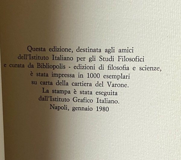 Questa edizione, destinata agli amici dell'Istituto Italiano per gli Studi Filosofici e curata da Bibliopolis - edizioni di filosofia e scienze, è stata impressa in 1000 esemplari su carta della cartiera del Varone.