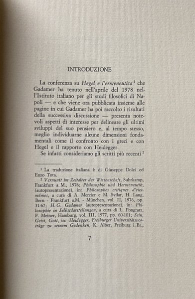 La conferenza su Hegel e l'ermeneutica che Gadamer ha tenuto il 22 aprile 1978 nell'Istituto italiano per gli studi filosofici di Napoli e che viene ora pubblicata insieme alle pagine in cui Gadamer ha poi raccolto i risultati della successiva discussione, presenta notevoli aspetti di interesse per delineare gli ultimi sviluppi del suo pensiero e, al tempo stesso, meglio individuarne alcune dimensioni fondamentali come il confronto con i greci e con Hegel e il rapporto con Heidegger.