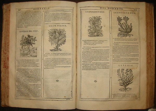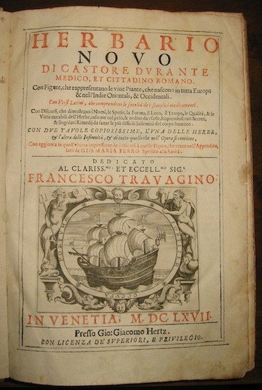Folio (cm. 33), 6 cc.nn., 476 pp., 14 cc.nn. con 965 ill.ni xilografiche. Frontis. in rosso e nero con grande marca calcografica. Testo su due colonne. Legatura coeva in pergamena rigida con titolo ms. al ds. (bruniture e qualche abrasione marginale). Lievi aloni, alcune carte leggermente brunite. Alcune piccole macchie e tracce di cera a p. 192 e p. 233. Un foro che interessa in minima parte il testo a p. 181. Nel complesso, esemplare completo, genuino ed in buono stato di conservazione. Edizione tarda (la prima è del 1585) di questo popolare e affascinante erbario italiano. Le descrizioni delle piante, che comprendono le specifiche virtù medicinali, sono perlopiù accompagnate da alcuni versi in latino. Pritzel, 2552.