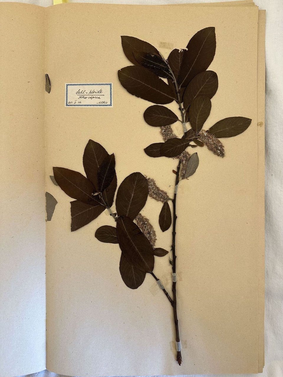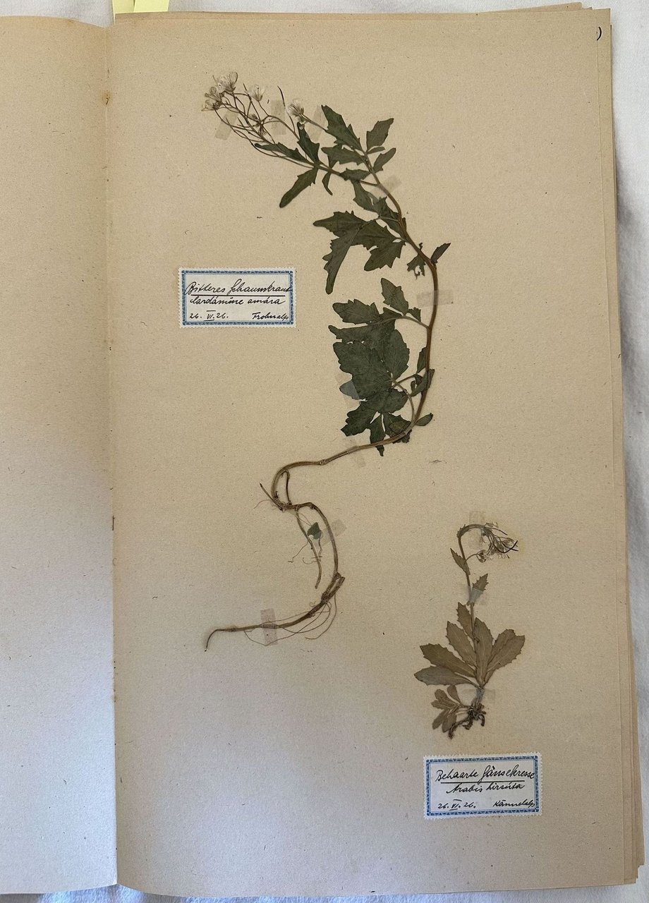 Bellissimo erbario composto nel periodo 1920/24 dal botanico tedesco Anton Karl Schindler (1879-1964). Schindler dopo essersi laureato in Germania si spostò in Cina dove raccolse numerose specie ora conservate al Natural History Museum di Londra. Per quasi tutta la vita si occupò dello studio delle piante. Questo erbario contiene 45 fogli divisi per famiglia contenenti circa 94 specie di piante tra cui numerose specie alpine provenienti da Frohnalp, la catena montana Albis in Svizzera, Kannelalp, Mollis, Glarus e altre località. Per ogni esemplare è presente l'etichetta con il nome in volgare in lingua tedesca, nome scientifico, luogo e data di raccolta. Alcune tra le specie presenti: Mercurialis perennis, Euphorbia, Polygala, Oxalis acetosella, Geranium silvaticum, Geranium robertianum, Trifolium, Alchemilla vulgaris, Lieversia montana, Sorbus, Saxifraga, Sedum, Reseda luxea, Anemone alpina, Stellaria media, Lichnis, Populus tremula, Salix caporea, Plaxanthera, Histera, Tanus, Allium ursinum, Lisula campestris, Juniperus, Larix, Taxus, Hieracium, Bellidiastrum, Valeriana, Asperula taurina, Globulariaceae, Veronica, Digitalis ambigua, Bartsia alpina, Vincetoxicum officinale, Primula, Genziana, Alpen risplugras, Carex, Acer campestre, Daphne, Viola silvestris, Primula, Epilobium augustifolium . Le condizioni di conservazioni sono veramente eccellenti In folio. cm. 47x28,5. Pp. (45). Peso Kg. 2,100.Very beautiful herbarium made in the period 1920/24 by the german botanist Anton Karl Schindler (1879-1964). Schindler got a degree in Germany and moved in China where he collected different aspecies now in the Natural History Museum of London. For almost all his life he was engaged in the study of plants. This herbarium contains 45 pages divided per family containing circa 94 speces of plants many of them alpine species taken in Frohnalp, the mountain chain Albis in Switzerland, Kannelalp, Mollis, Glarus e altre località. Foir each species there is the label with the vulgar name, scientiphic name, place and date of collection. The species inside: Mercurialis perennis, Euphorbia, Polygala, Oxalis acetosella, Geranium silvaticum, Geranium robertianum, Trifolium, Alchemilla vulgaris, Lieversia montana, Sorbus, Saxifraga, Sedum, Reseda luxea, Anemone alpina, Stellaria media, Lichnis, Populus tremula, Salix caporea, Plaxanthera, Histera, Tanus, Allium ursinum, Lisula campestris, Juniperus, Larix, Taxus, Hieracium, Bellidiastrum, Valeriana, Asperula taurina, Globulariaceae, Veronica, Digitalis ambigua, Bartsia alpina, Vincetoxicum officinale, Primula, Genziana, Alpen risplugras, Carex, Acer campestre, Daphne, Viola silvestris, Primula, Epilobium augustifolium . Excelelnt conditions. In folio. cm. 47x28,5. Pp. (45). Weight Kg. 2,100.