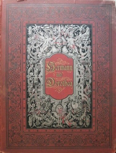 In-folio piccolo, pp. 68, legatura editoriale t. tela rossa con titolo in oro, ricca bordura figurata con grottesche, putti, festoni, etc., impressa in argento su fondo nero e ulteriore bordura a motivi floreali e vegetali in nero (quest'ultima è ripetuta al piatto posteriore). Tagli dorati. Testo in carattere gotico. 8 tavv. in b.n. applicate f.t. di Arthur Freiherr von Ramberg dagli originali di Friedrich Bruckmann. Minime sbiaditure al piatto anteriore. Ottimo esemplare. Elegante edizione figurata di questo celebre idillio goethiano in esametri.