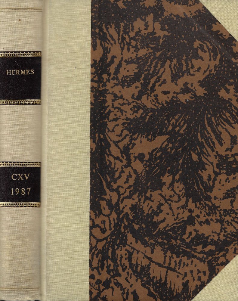 Annata completa, anno 1987, della rivista di filologia classica pubblicata da Jochen Bleicken, Hartmut Erbse e Willy Schetter. Mezza legatura con angoli in tela chiara e piatti marmorizzati, con titoli in oro solo al dorso all'interno di tassello in pelle marrone, appena brunita dal tempo. Pagine lievemente ingiallite, salde, con ampio margine e note al piede, con testi in inglese e tedesco. Numero pagine 512.
