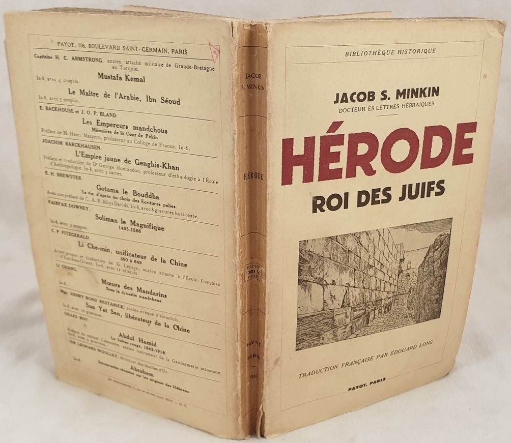 Interessante monografia del 1937 sul re Erode scritto da Jacob Minkin. Traduzione francese a cura di Edouard Long. In buone condizioni. Copertina editoriale in buone condizioni generali con lievi usure ai margini e dorso. Legatura in buone condizioni. All'interno le pagine si presentano in ottime condizioni con rare fioriture. In 8. Dim. 23x14,5 cm. Pp. 251+(5).<BR><BR>