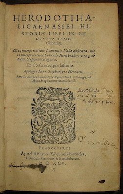 Herodoti Halicarnassei Historiae Libri IX: et De Vita Homeri libellus. Illi ex interpretatione Laurentio Vallae adscripta, hic ex interpretatione Conradi Heresbachij: utraque ab Henr. Stephano recognita. Ex Ctesia excerptae historiae. Apologia Henr. Stephani pro Herodoto. Accessit in hac editione Spicilegium Frid. Sylburgij, ad Henr. Stephanum virum clariss.