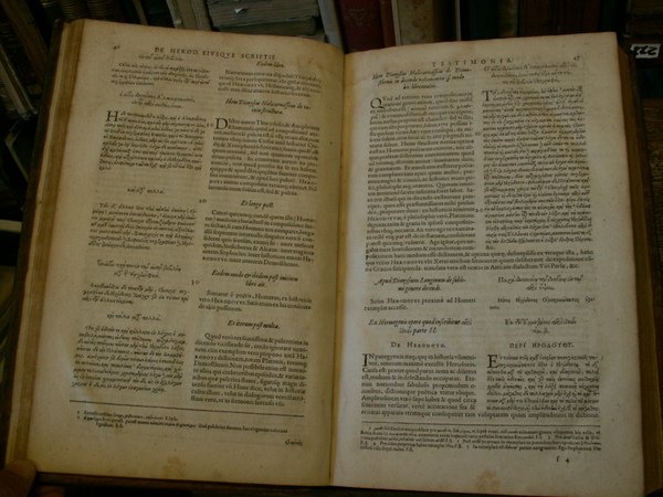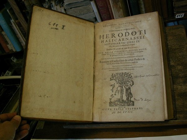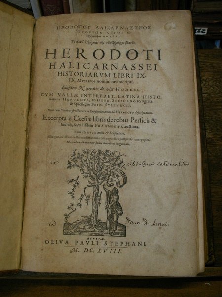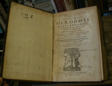 Volume in folio legato in pelle, titolo al tassello al dorso a 6 nervi decorato ai piccoli ferri (minime mende), frontesoizio con ampia vignetta tipografica (exlibris a pennino), 5 carte, 52 pp. di epigrammata e proemia, 708 pp. di testo su due colonne (greco e latino a fronte), 4 tavole silografiche pi volte ripiegate afferenti Babilonia, la sua torre, i giardini di Semiramide ecc., 15 carte d'indici. Eccellente impressione dell'opera del sommo storico greco, gi tradotto dal grande Henri Estienne e poi ancora da Jungermann nel 1608, l'edizione che si presenta la summula delle due voluta dal figlio di Henri, Paul, e risulta a giudizio di tutti i critici la migliore edizione finallora impressa, citata anche come 'Un livre de choix et d'une grande importance philologique et linguistique'. Anche solo accennare all'opera d'Erodoto risulta pleonastico. In pi che bello stato, scarsissime ed ininfluenti mende d'uso