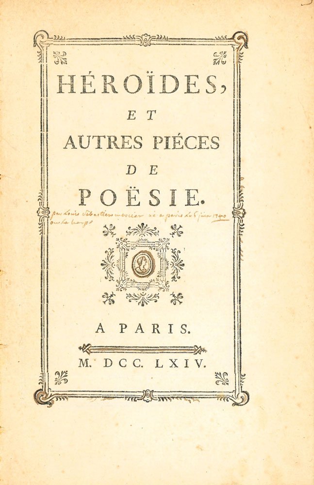 LIBRORarissima edizione originale.Mancanze al dorso, all’interno ottime condizioni. Antica nota al frontespizio «par Louis Sebastien Mercier né à Paris le 6 juin 1740».Louis-Sébastien Mercier (1740-1814) fu importante esponente dell’Illuminismo francese, scrittore saggista e drammaturgo. Estremamente prolifico, celebre per il romanzo «l’An 2440» e per il suo «Tableau de Paris», compose ben cinquanta pièces teatrali. Tra i suoi rari tentativi di composizione poetica sono da annoverare queste «Héroïdes», che non riscossero però il successo sperato: da qui, le successive prese di posizione dell’autore contro le opere in versi. Testo elegantemente encarré con cornice a doppio filetto. Il volume è di estrema rarità: in OCLC se ne riscontra un solo esemplare, alla Bibliothèque Nationale de France.