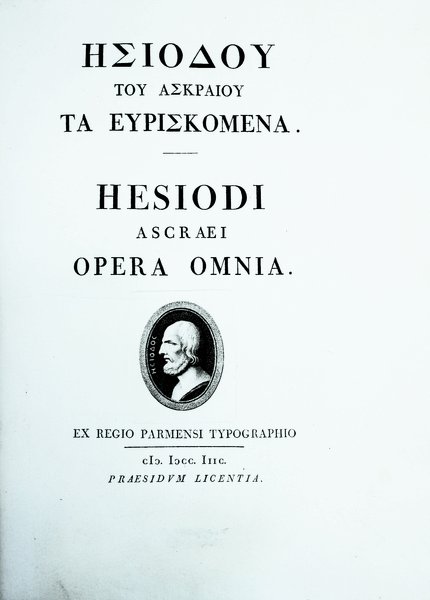 In-4 p. (mm. 307x219), mz. pelle coeva, tit. ms. su tassello al dorso, occhietto (a noi mancante), 16 pp., occhietto greco, 110 pp.; frontespizio in latino, XXXV pp., occhietto latino, 248 pp. Opera Omnia di Esiodo con testo in greco e in latino. Ritratto del poeta in medaglione, inc. in rame, ai due frontespizi; dedica in versi latini di Bernardus Zamagna Ad Ferdinandum Austriacum ecc... Nel frontespizio latino si legge: Hesiodi Opera Omnnia latinis versibus expressa atque illustrata a Bernardo Zamagna Ragusino. "Prima edizione" bodoniana. Cfr. Brooks,290.Macchiette sul solo verso del primo frontesp.; tracce d'uso sulle prime 5 carte, altrimenti fresco esemplare con barbe .