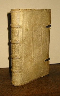 8vo (cm. 15,5), 8 cc.nn., 381(1) pp., 17 cc.nn. Marca tipografica al frontis. Capilettera xilografici. Testo in latino e greco. Legatura coeva in pelle di scrofa con nervi. Ricche impressioni a secco ai piatti. Fermagli metallici. Tagli rossi. Piccola firma di appartenenza cancellata e margine inferiore del frontespizio risarcito. Percorso di tarlo al margine inferiore bianco (lontano dal testo) delle ultime quindici carte. Pagine lievemente ed uniformemente brunite. Nel complesso esemplare in più che buono stato di conservazione, in affascinante legatura d’epoca.