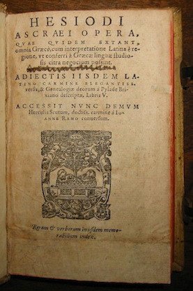 Hesiodi Ascraei Opera, quae quidem extant, omnia Graece, cum interpretatione Latina a regione, ut conferri a Graecae linguae studiosis citra negocium possint. Adiectis ijsdem latino carmine elegantiss. versis, & geneologiae deorum a Pylade Brixiano descriptae, Libris V. Accessit nunc demum Herculis Scutum, doctiss. carmine a Ioanne Ramo conversum.