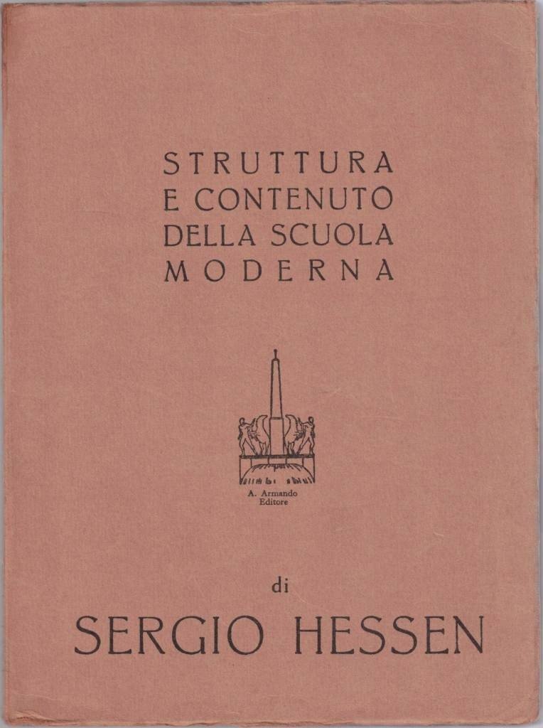 Sergio (Sergej) Hessen, Struttura e contenuto della scuola moderna. Principi della didattica nuova, Avio Armando Armando Editore, Roma 1959, quinta ed., pp. 254, cm 20, br. ed. Collana I problemi della pedagogia, vol. 2. Titolo originale: Struktura i tresc szkoly wspolczesnej. Zarys dydaktyki agolnej. Traduzione di Hanna Mirecka e Luigi Volpicelli. Indice: Prefazione dell’autore all’edizione italiana – Cap. I: Che cosa significa la scuola unica – Cap. II: L’insegnamento elementare come insegnamento globale – Cap. III: Essenza e limite dell’insegnamento collegato – Cap. IV: Il principio dell’integrità dell’insegnamento nel II e nel III grado della scuola – Cap. V: La scuola integrativa professionale come scuola obbligatoria di terzo grado – Conclusione: Le due didattiche – Appendice: I principi e la realtà. Minime tracce d’uso alla brossura, qualche sporadica sottolineatura e annotazione a margine, lievissima brunitura della carta, per il resto molto ben conservato.