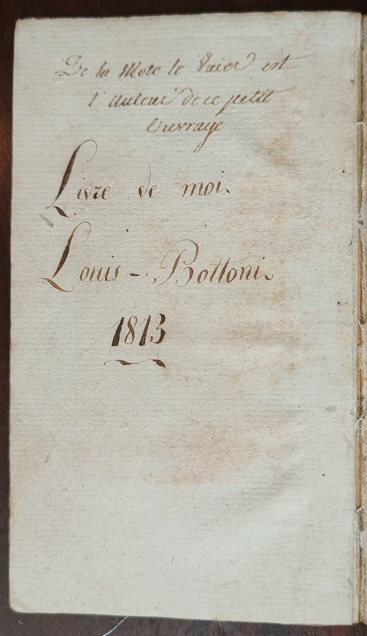 Cm 14,9. Brossura rigida moderna. Pp. (1) 157 (2). Testo in francese, racconto a chiave autobiografico di genere goliardico. Alla prima carta bianca si legge: Livre de moi / Louis Bottoni / 1813.