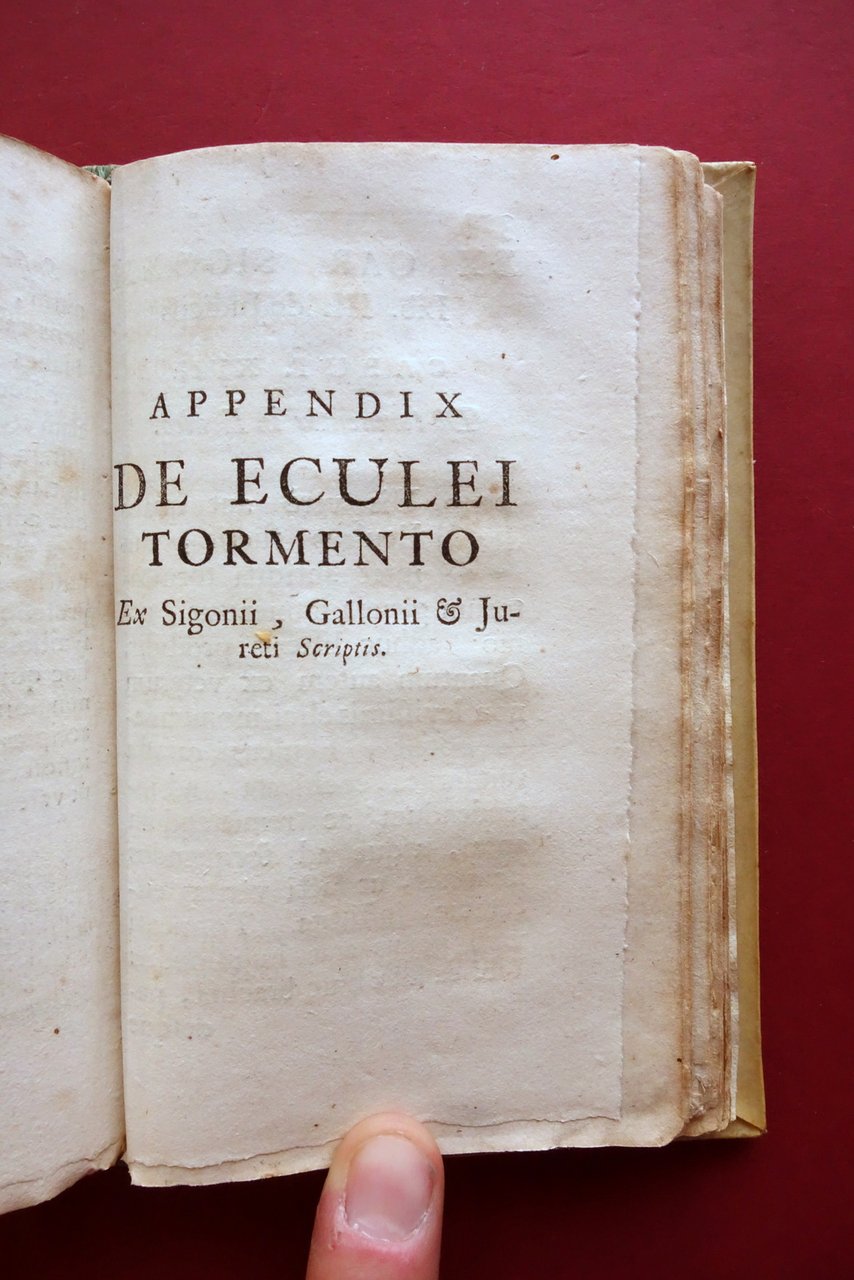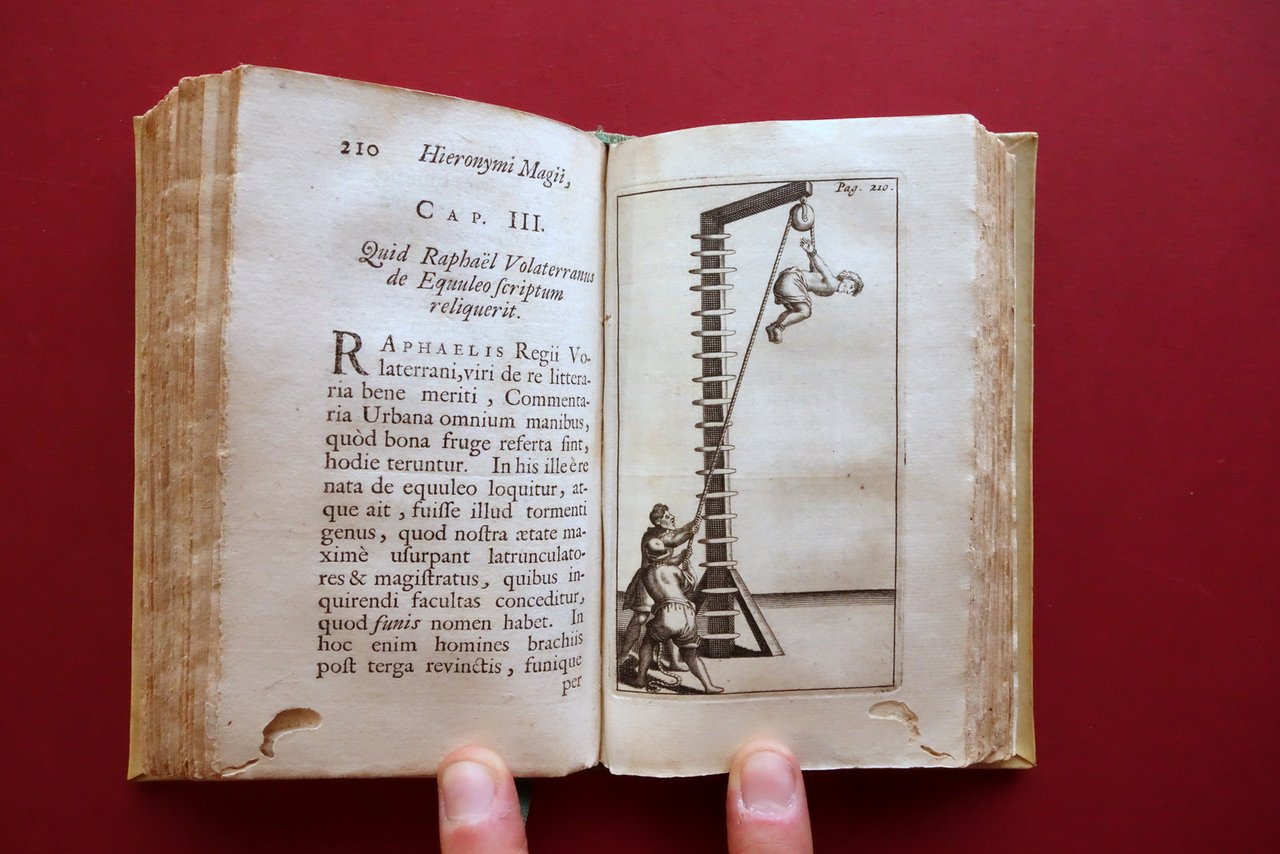 Seicentina, † Hieronymi Magii Anglarensis De Tintinnabulis liber postumus Franciscus Sweertius F. notis illustravit accedit eiusdem Magii De Equuleo Liber cum notis G. Jungermanni ut et appendix virorum illustrium idem argumentum pertractantium Apud Henr. Wetsenium, Amsteldami 1689; cm 14,5x8,5; pp. [24]-396-[14], con complessive 21 belle tavole incise in rame, cosÏ suddivise: 11 nel De Tintinnabulis, di cui 2 ripiegate; 10 nel de Equuleo, di cui 1 ripiegata; pregevole legatura settecentesca in piena pelle con titolo impresso in oro entro tassello al dorso. Condizioni di conservazione Buone condizioni con tracce d'uso e leggeri segni del tempo; coperta con alcuni lievi aloni e macchioline. Interni buoni con lieve / minimo foxing; angolo inferore di circa una cinquantina di pagine con piccoli camminamenti da tarlo che non comportano perdite di testo o di immagine (vedi foto). † Edizione che raccoglie due opere del Maggi pi˘ un breve trattato-appendice: il De Tintinnabulis", sulle campane e ogni loro genere di uso e significato nei riti e nei costumi di numerosi popoli; il "De Equuleo", sulla tortura, i suoi strumenti e pratiche; il breve trattato "Appendix de Eculei tormento - ex Sigonii, Gallonii et Jureti scriptis". Le tre opere, postume, furono redatte durante l'imprigionamento del Maggi a Costantinopoli, dove fu tratto dopo la resa di Famagosta del 1572. Bellissime le tavole incise in rame a corredo del testo (vedi foto). Girolamo Maggi, erudito poliedrico sia in ambito umanistico che scientifico, tra i suoi numerosi incarichi fu giudice e ingegnere militare per la Repubblica Veneziana durante l'assedio di Famagosta del 1571; in tale frangente contribuÏ a realizzare fortificazioni e meccanismi per la difesa della piazzaforte. Catturato dopo la caduta di Cipro, fu condotto prigioniero a Costantinopoli, dove scrisse i trattati di cui sopra. Il Maggi non riuscÏ a vedere la loro pubblicazione in quanto fu giustiziato per strangolamento nel 1572. † SETT166.L24604 N P "