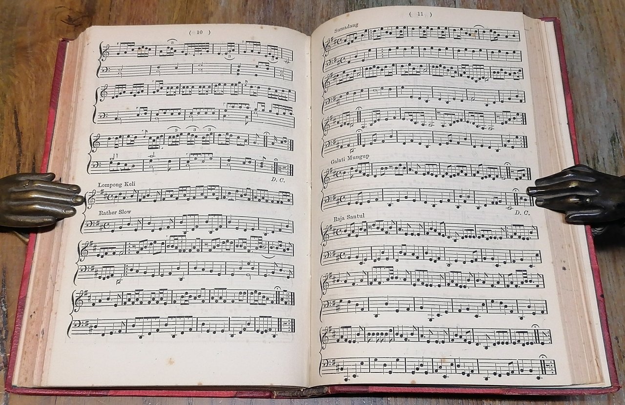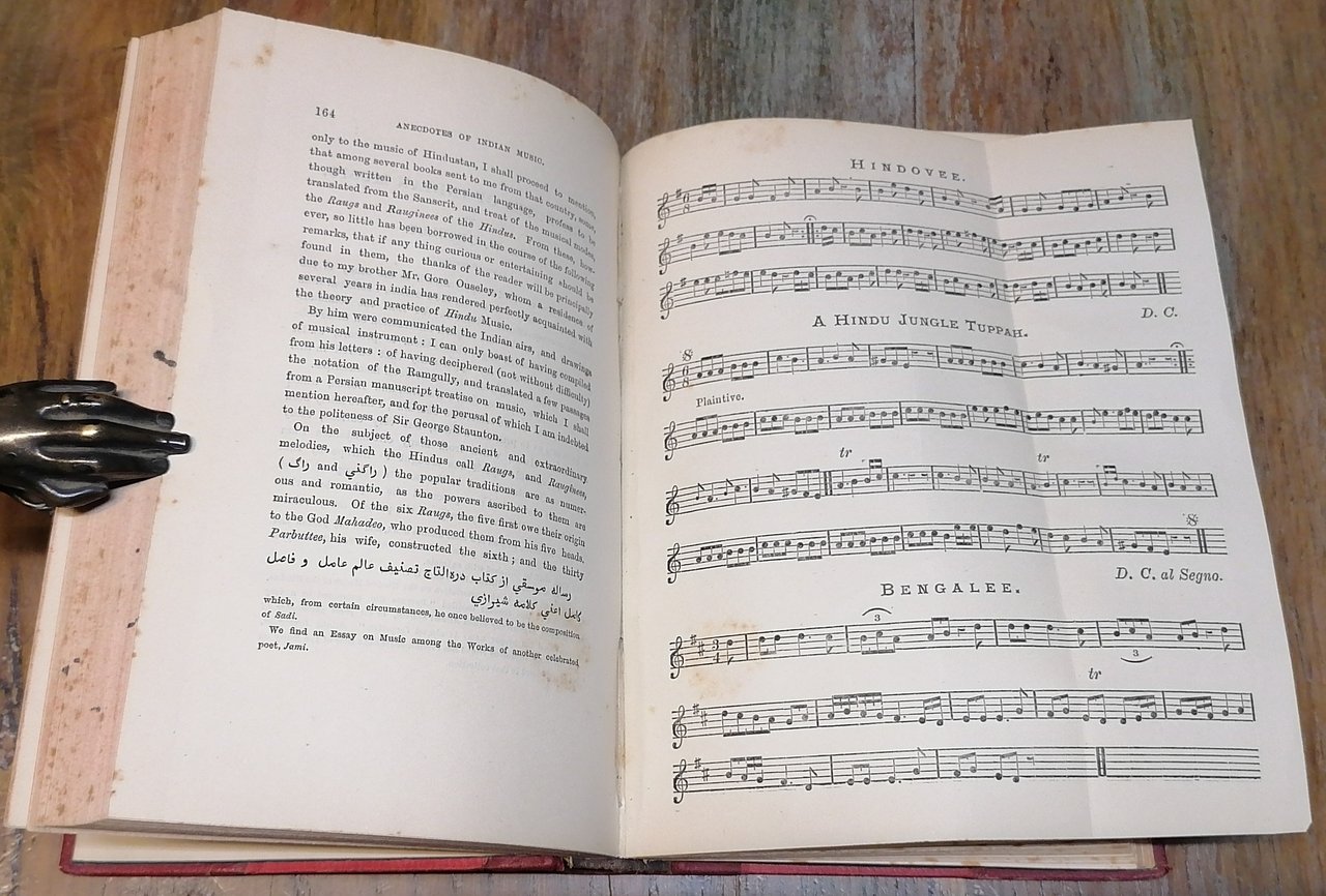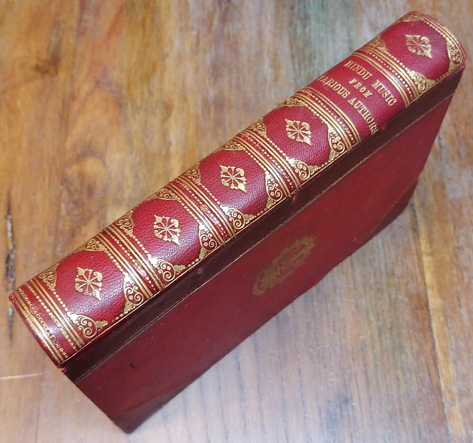 (Musica; Asia; Musicologia indiana; Raj britannico; India; Ceylon; Indostan; Strumenti musicali orientali) In 8°, legatura coeva in mezza pelle bordeaux con punte, titolo e ricchi fregi impressi in oro al dorso, fregio dorato al piatto anteriore, guardie in carta verde, pp. (18),IX,423, con 11 tavole in bianco e nero fuori testo (strumenti, scritti in sanscrito, ecc.) e numerose tabelle musicali nel testo, anche a piena pagina. Trattato su strumenti musicali, teoria, musica tradizionale dell'Impero Anglo-Indiano con contributi di vari autori. "A treatise on the Music of Hindoostan" by Captain N. Augustus Willard. "On the Musical Modes of the Hindoos" by Sir William Jones. "Anecdotes of Indian Music" by Sir W. Ouseley. "On the Gramas of Musical Scales of the Hindus" by J. D. Paterson. "On the Vina or Indian Lyre" by Francis Fowke. "Sungeet" by Francis Gladwin. "The Naqqarahkhanah and the Imperial Musicians" by H. Blochmann. "The Music of Hindustan of India" by William C. Stafford. "Music of the Indus" by J. Nathan. "On the Music of Hindustan" (From the Scientific Intelligence). "Catalogue of Indian Musical Instruments" by Col. P. T. French. "Music" by Lient-Col. James Tod. "Notes on the Musical Instruments of the Nepalese" by A. Campbell. "Music of Ceylon" by John Davy. "Music and Dancing" by Crawfurd, Esq. . Seconda edizione, opera completa in due parti, alcune lievi ed ininfluenti tracce di ossidazione peraltro ottimo stato di conservazione.