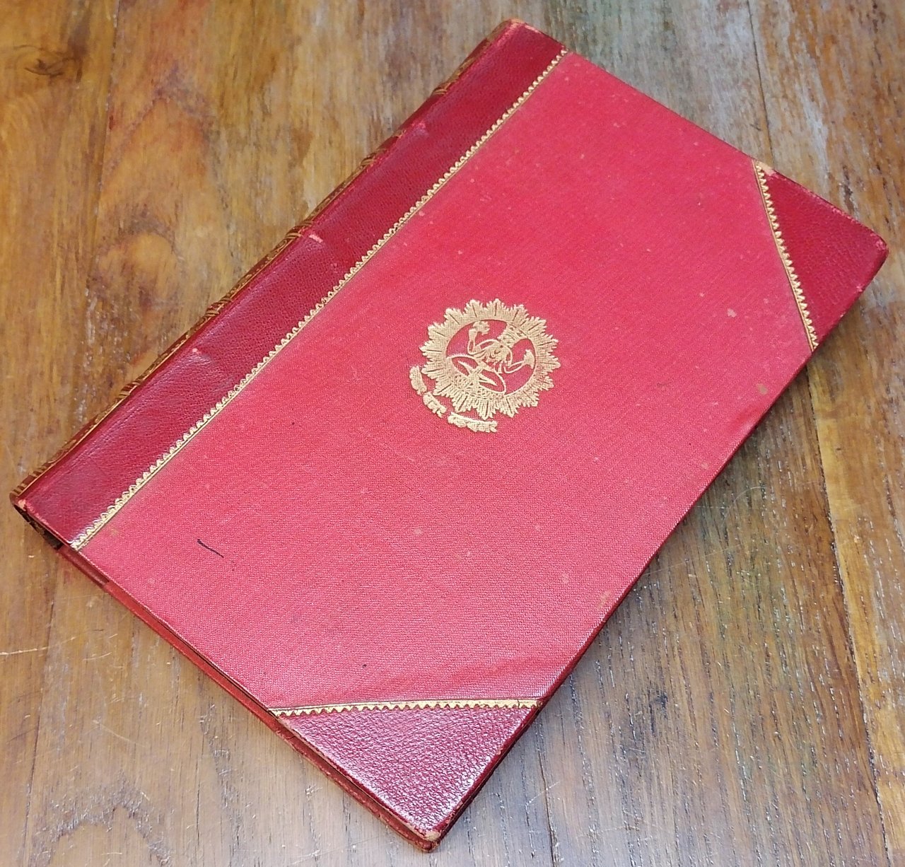 - legatura coeva in mezza pelle bordeaux con punte, titolo e ricchi fregi impressi in oro al dorso, fregio dorato al piatto anteriore, guardie in carta verde