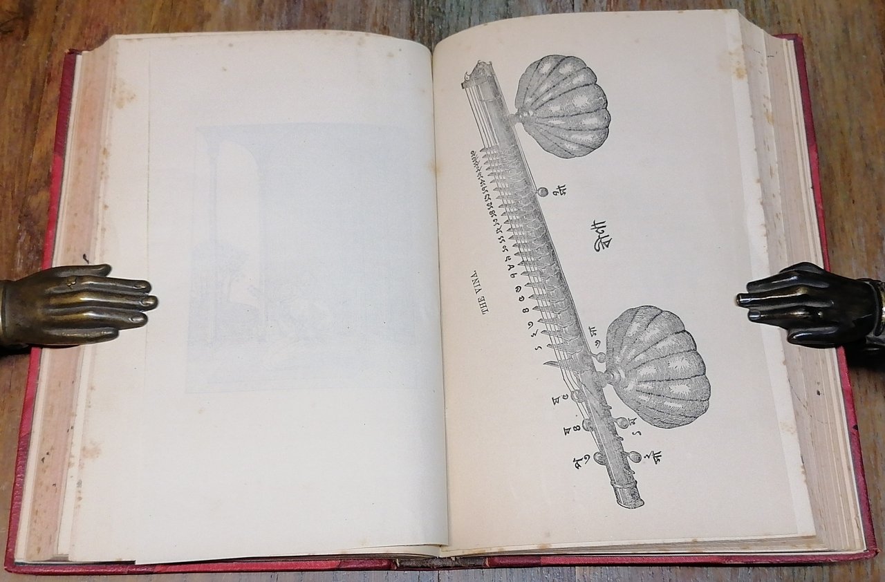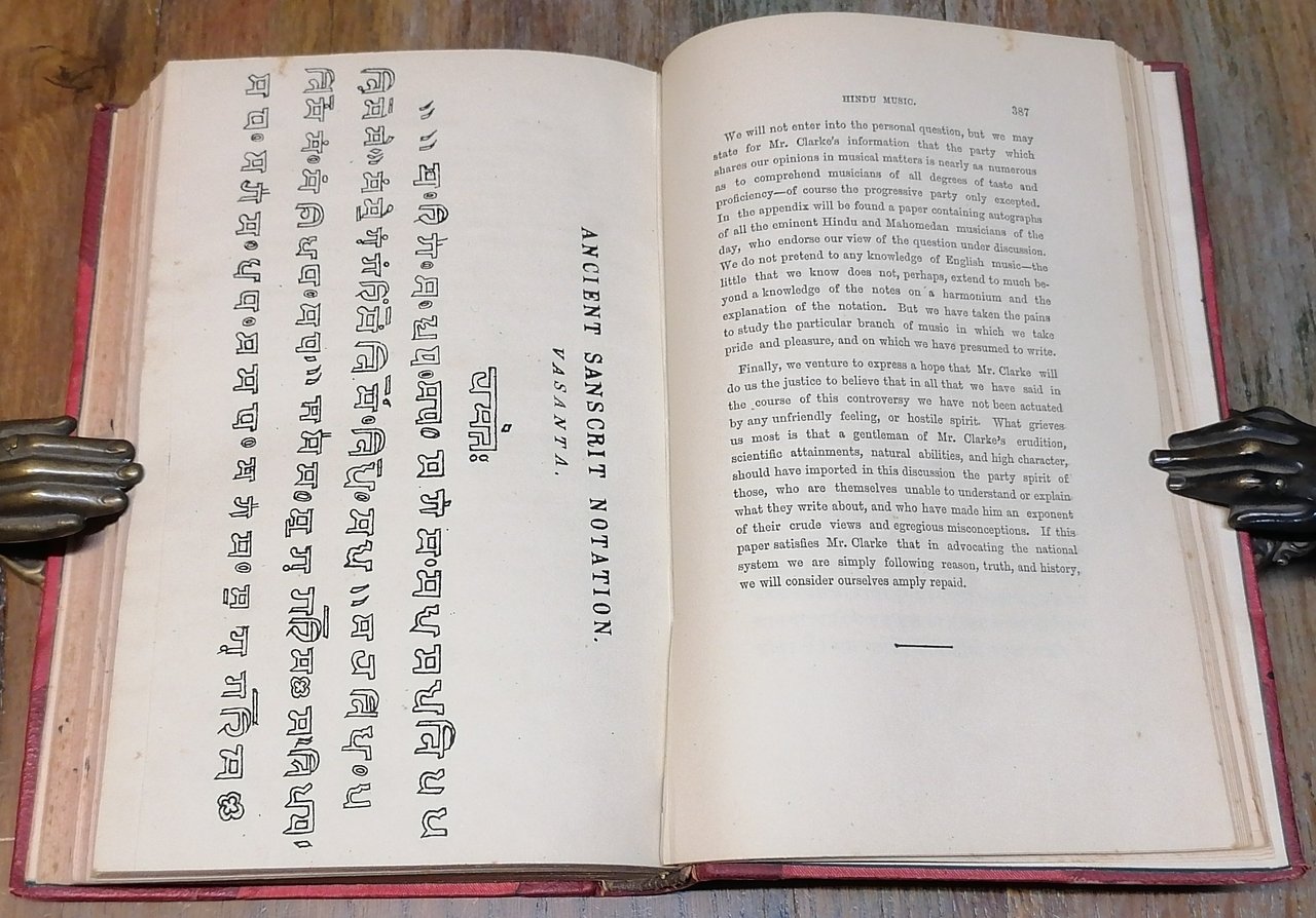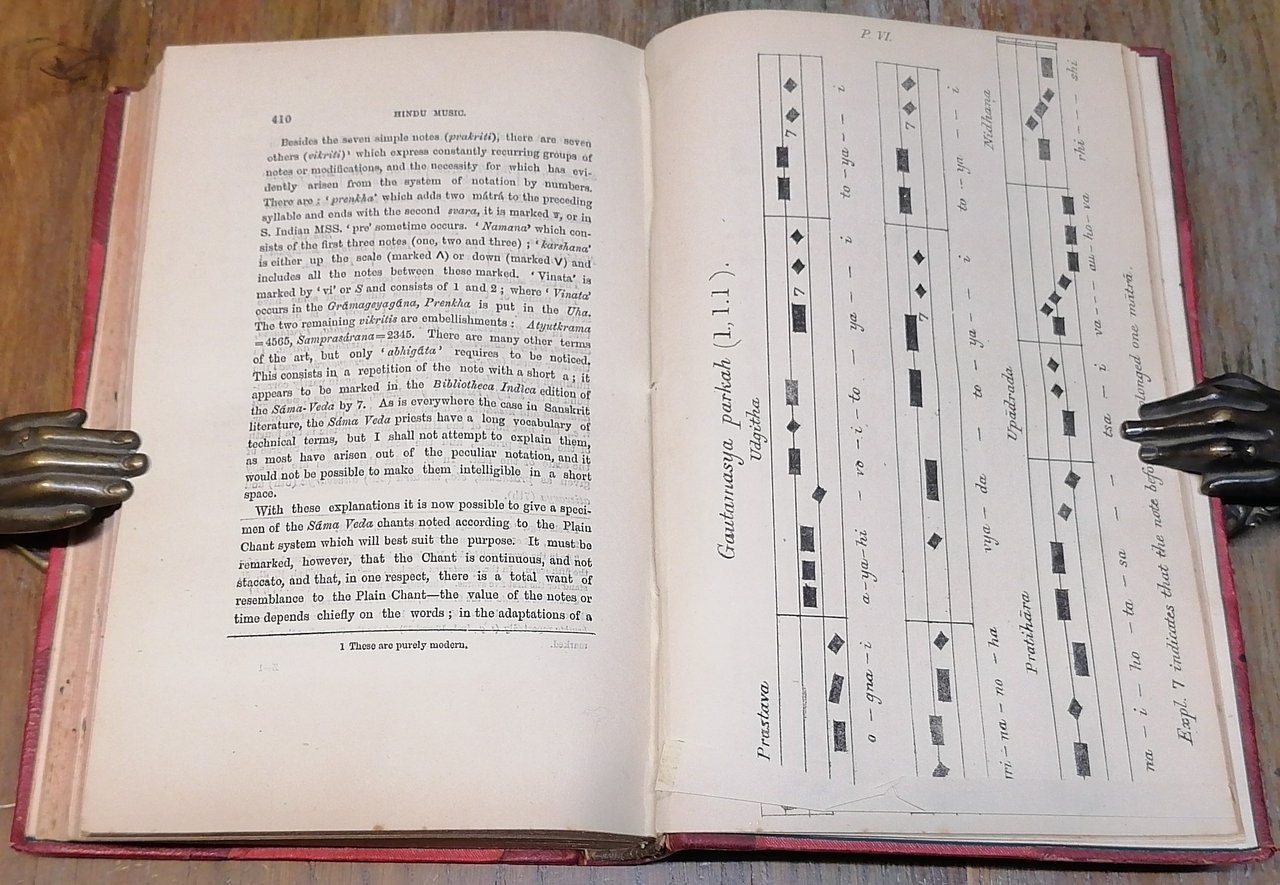 - pp. (18),IX,423, con 11 tavole in bianco e nero fuori testo (strumenti , scritti in sanscrito, ecc.) e numerose tabelle musicali nel testo, anche a piena pagina