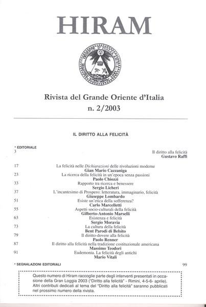 HIRAM N° 2/2003 (vedi indice allegato). RIVISTA DEL GRANDE ORIENTE D'ITALIA, ERASMO EDITORE 2003. In 8vo (cm 24x17) pag. 112 molte illustrazioni. OTTIMO stato