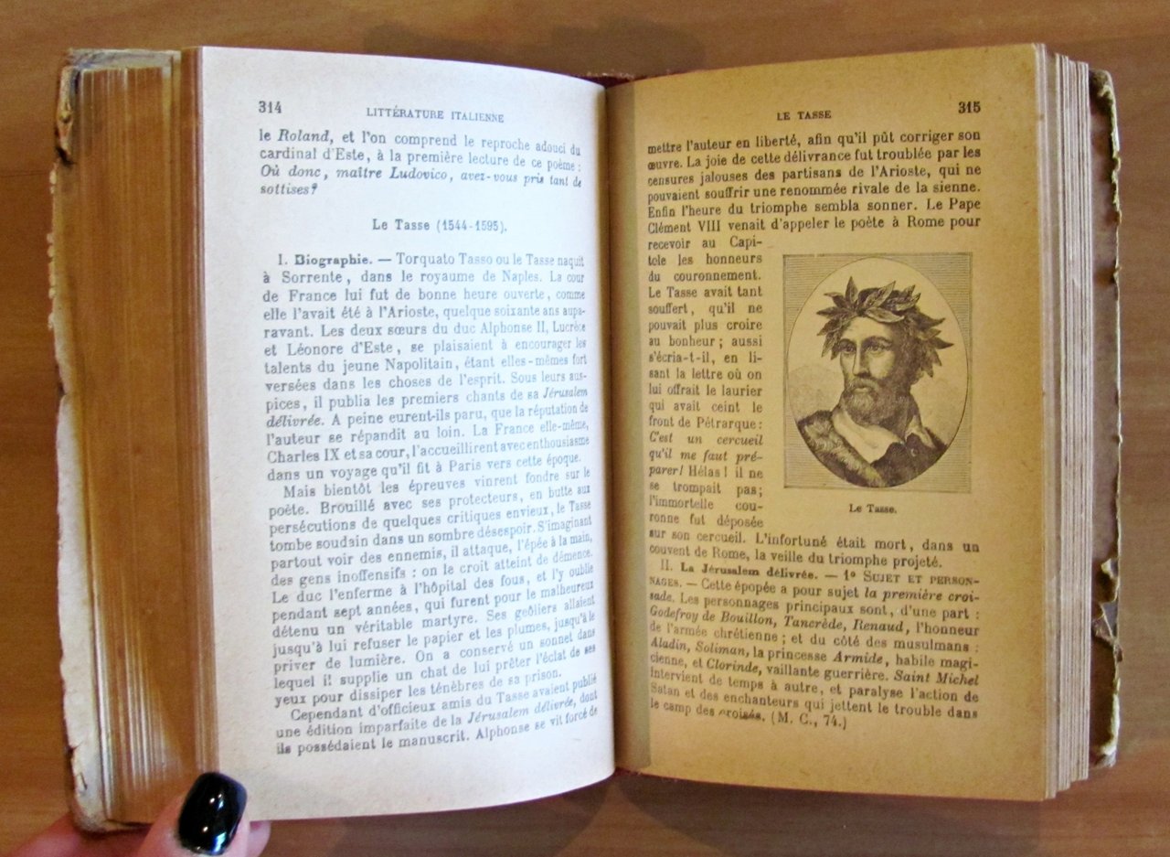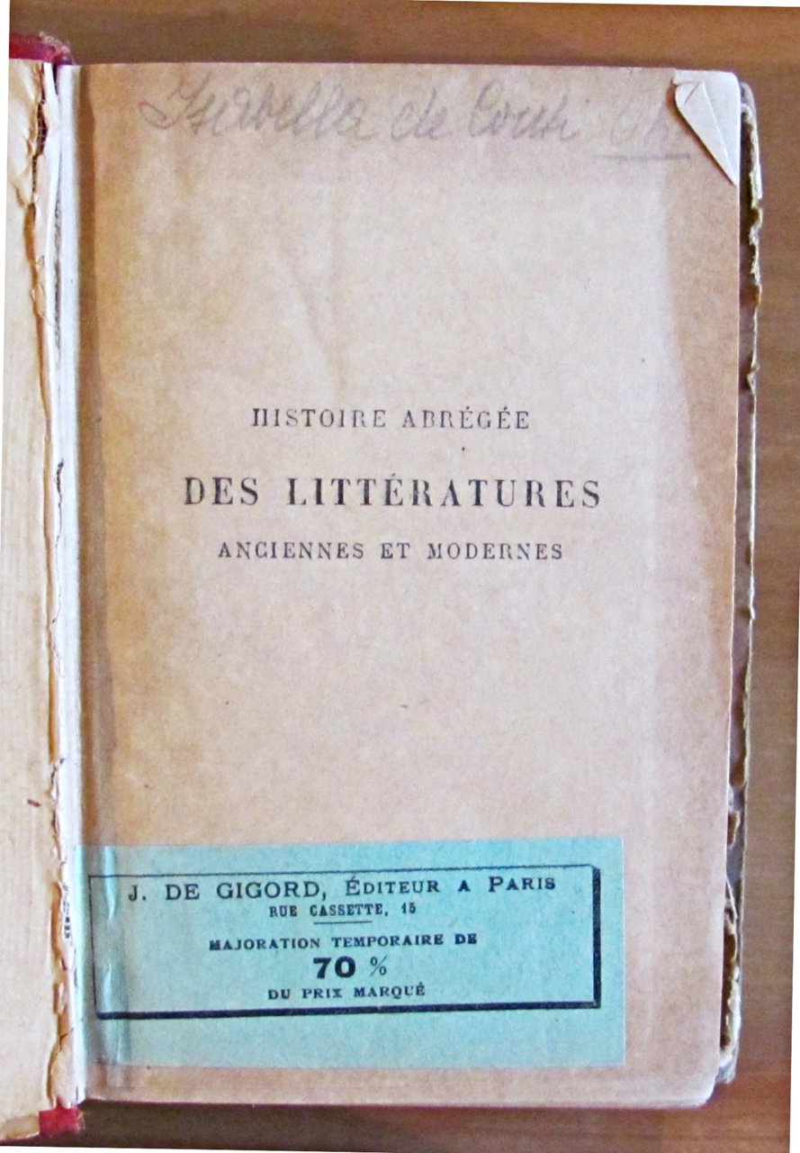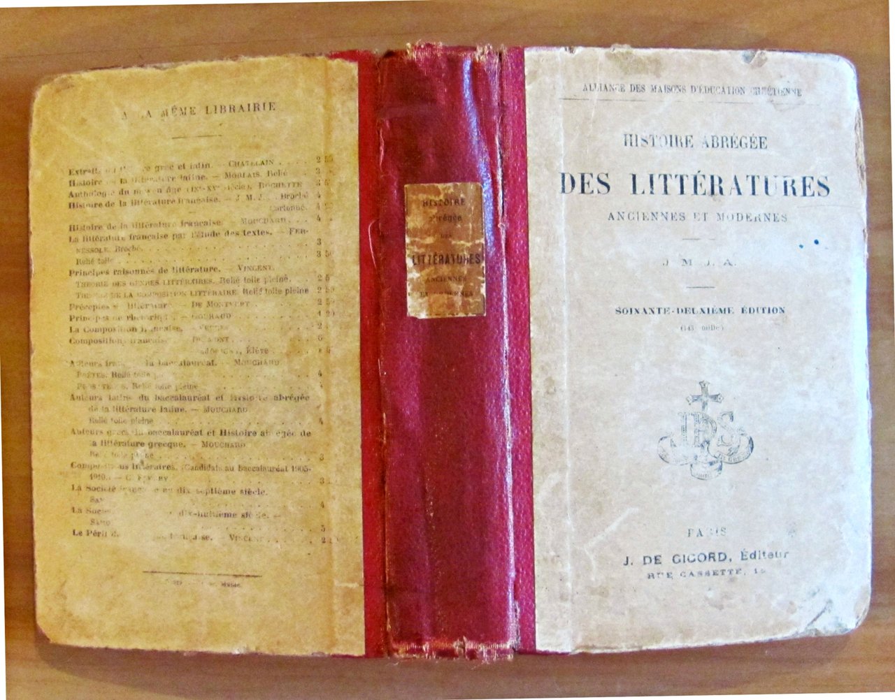 Avec tableaux synoptiques, morceaux choisis et portraits d'auteurs. I. Littérature française II. Littératures anciennes et modernes étrangères. Illustrazioni in b/n n.t. Ed. J. De Gigord - Paris, 1918. Cartonato editoriale con dorso in tela con imperfezioni del tempo alle copertine e al dorso. 10,5x16; pp.485. RARO e in BUONISSIMO STATO , Molto buono (Very Good)