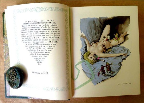 Un volume de format in 8° carré de 264 pp.; nombreuses illustrations libres en couleurs par Derambure. Reliure en demi maroquin à grains longs vert pomme; dos uniformément passé; couverture entièrement conservée. Tête dorée. Reliure signée Jean Etienne. Exemplaire N°467; un des 900 sur vélin BFK de Rives. Très bel état. Voir photos; pour adultes avertis.