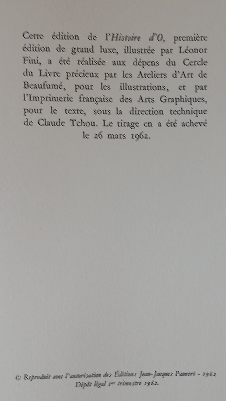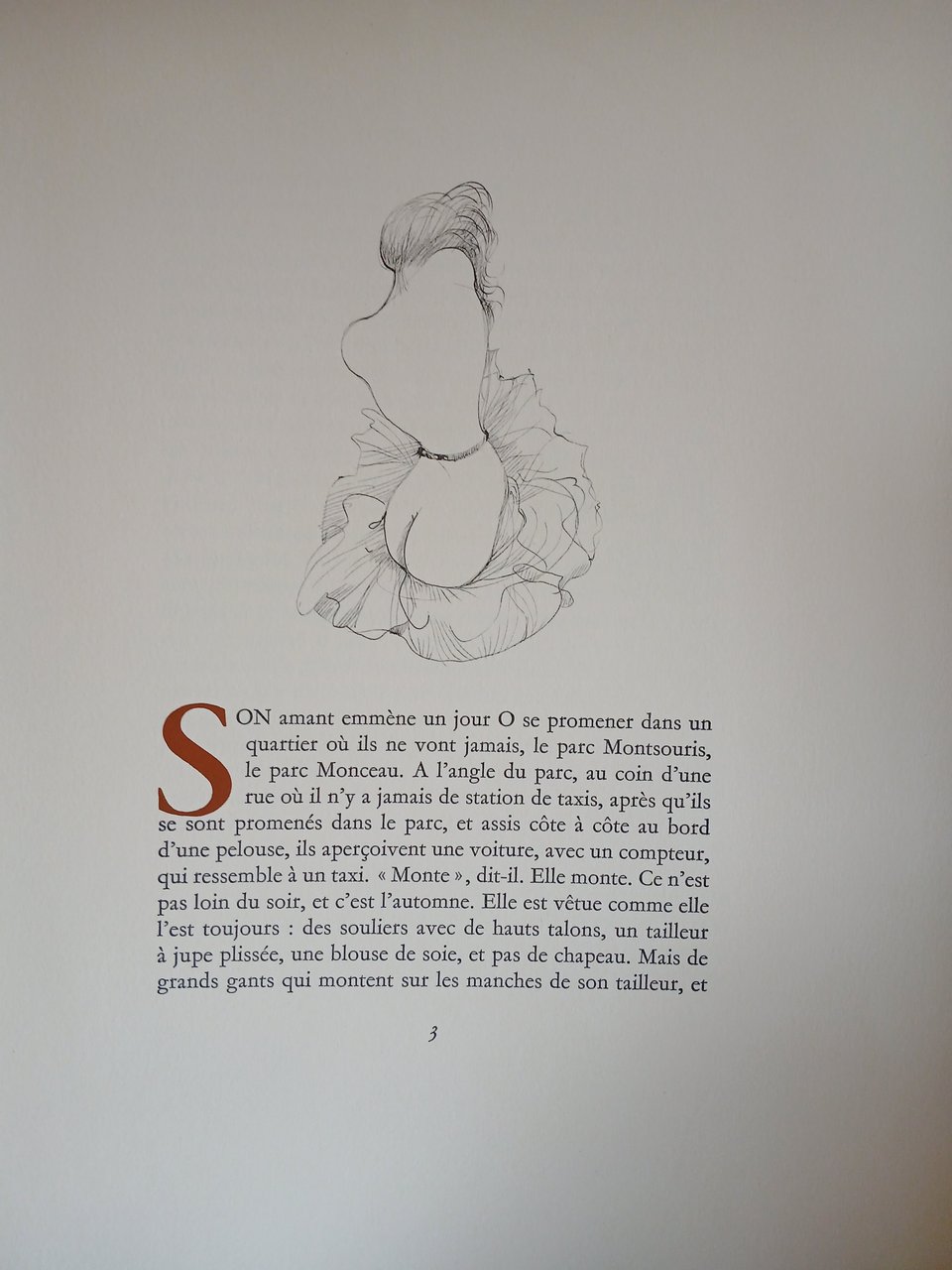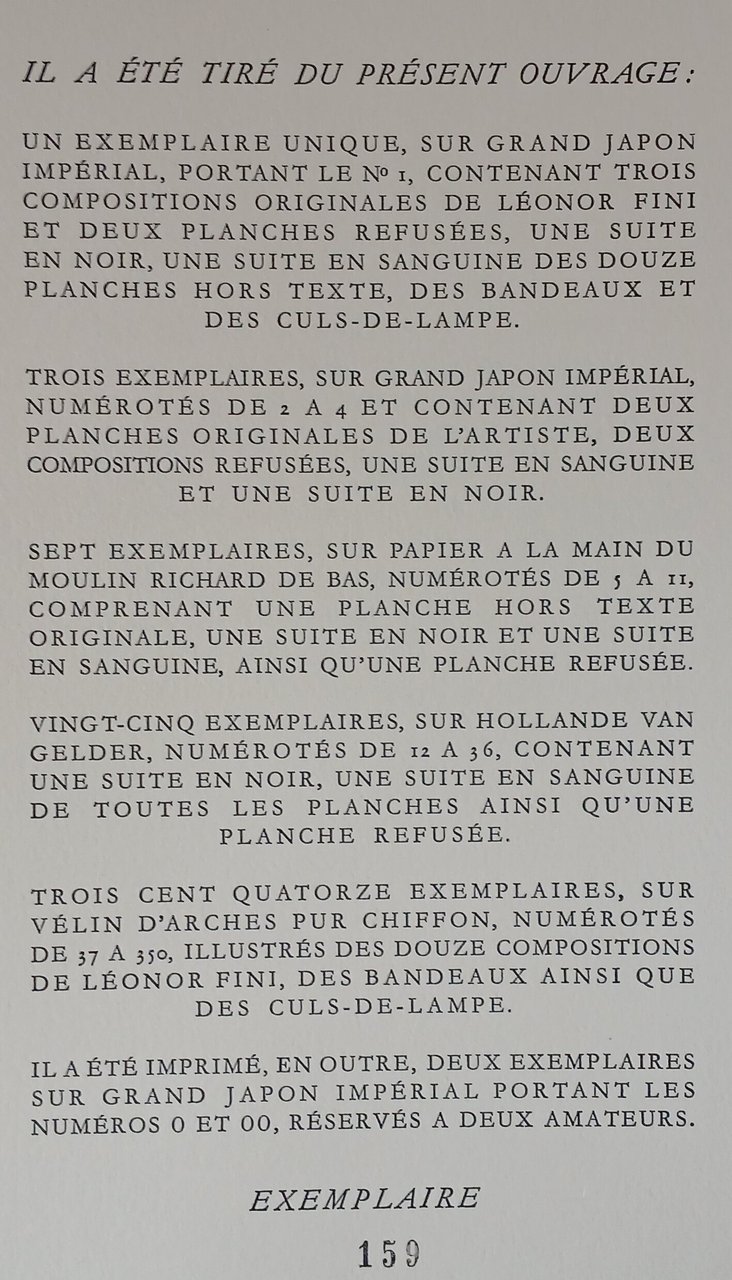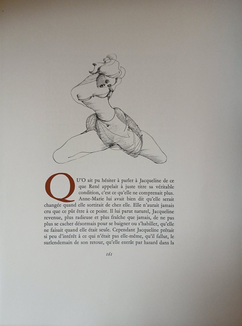 In folio (cm 38,5 x 28,5), custodia e cartella rigide rivestite in velluto nero, tassello in pergamena con titoli in oro al dorso, coperta in camicia in carta avorio, pp. XXII,(2),183,(5) a fogli sciolti, con 4 disegni, 4 testate ed un finale in nero nel testo, 16 tavole a colori a piena pagina fuori testo (non 12 come da colophon). Una prefazione di Jean Paulhan "Le Bonheur dans l'Esclavage". Esemplare n. 159 della tiratura di 314 copie su carta Velin Arches. Lievi tracce del tempo al velluto, peraltro ottimo stato di conservazione.